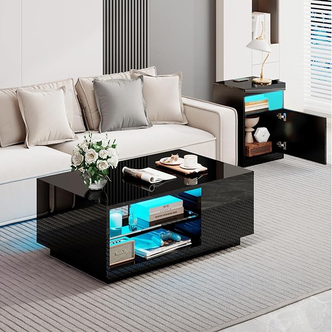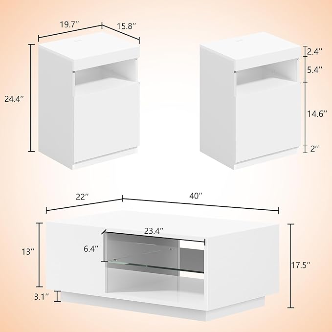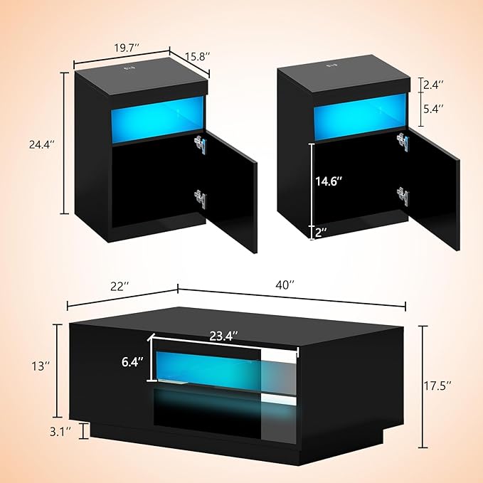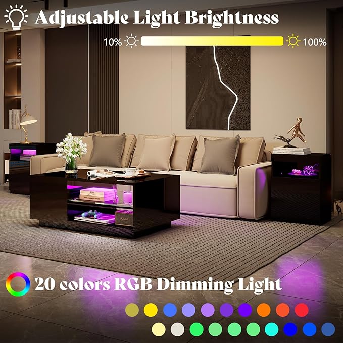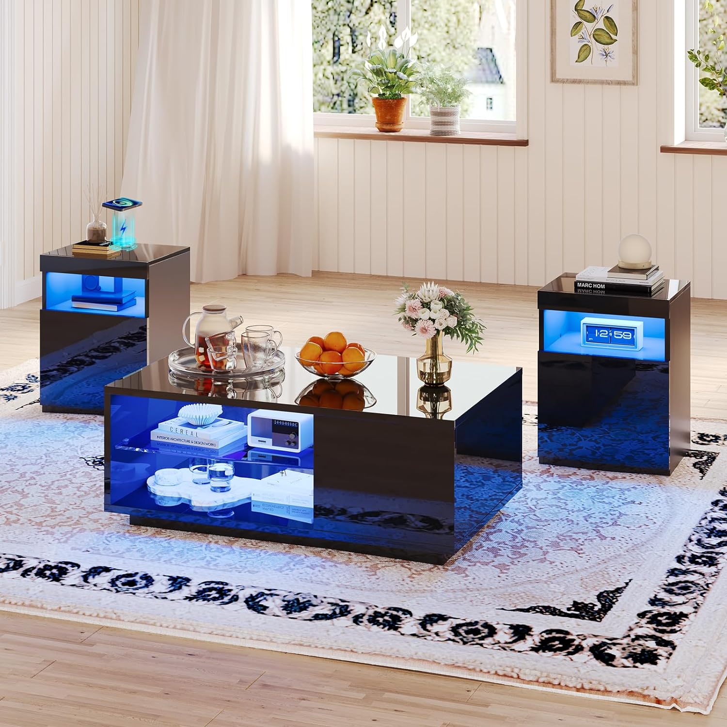 3-Piece Modern High Gloss LED Table Set, Coffee Table with 20-Color LED Lights, 2 End Tables with Wireless Charging Station for Living Room & Bedroom