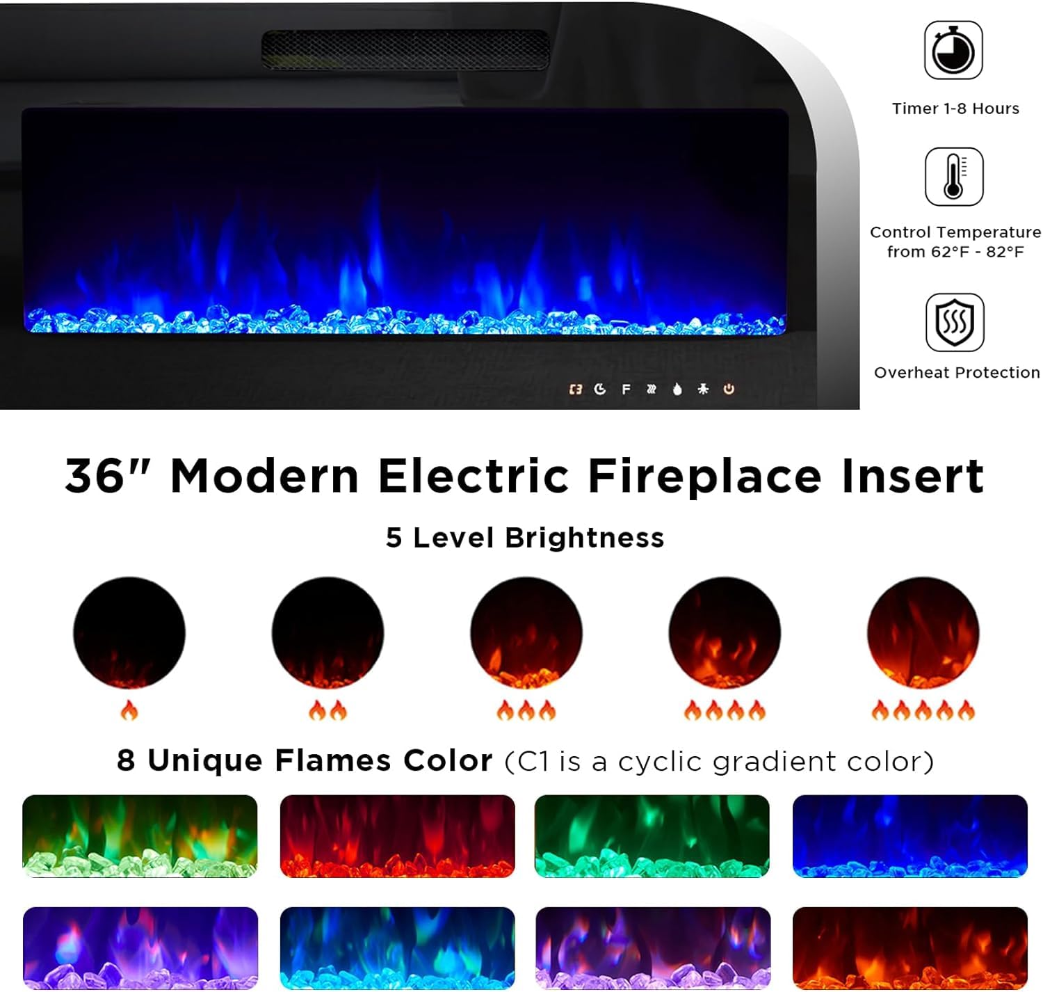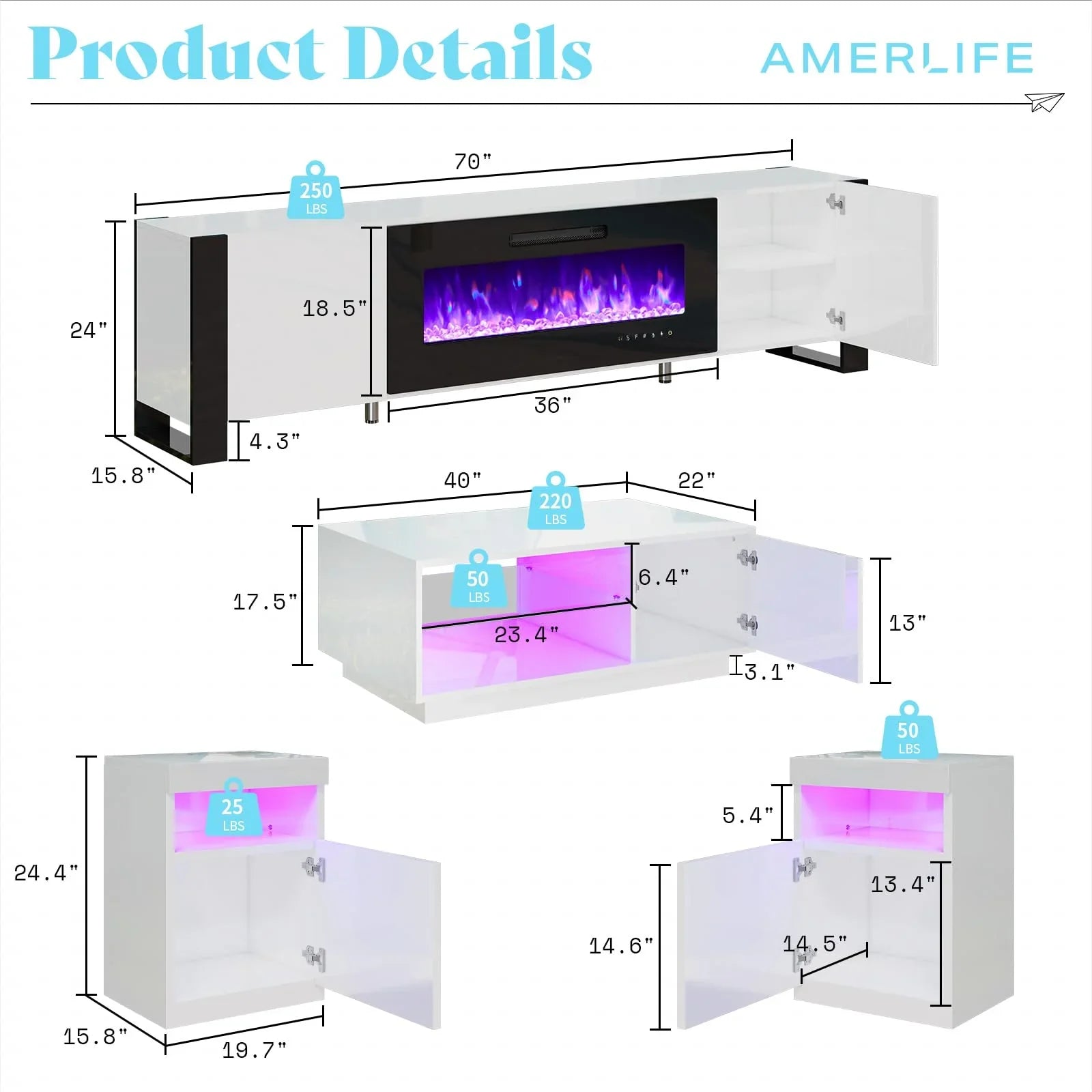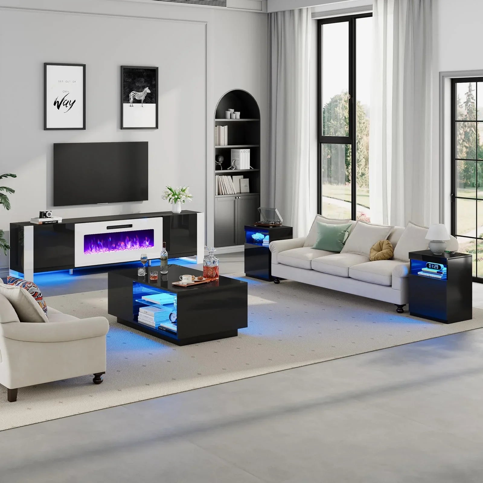 4-Piece Living Room Table Set, includes 70 Inch Fireplce TV Stand, Modern Coffee Table, LED Light Nightstands Set of 2, High Glossy Table Sets for Living Room Bedroom Office