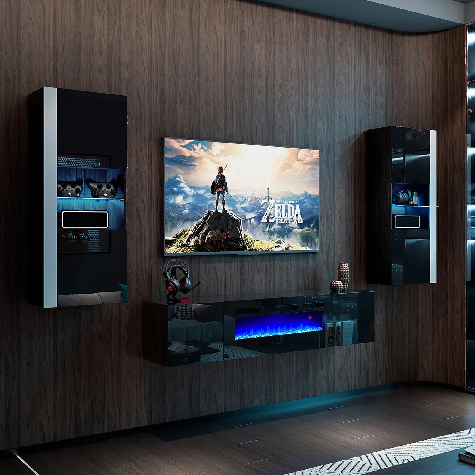 68" Floating Fireplace TV Stand, 2 x Wall Cabinets for Living Room, Black/White