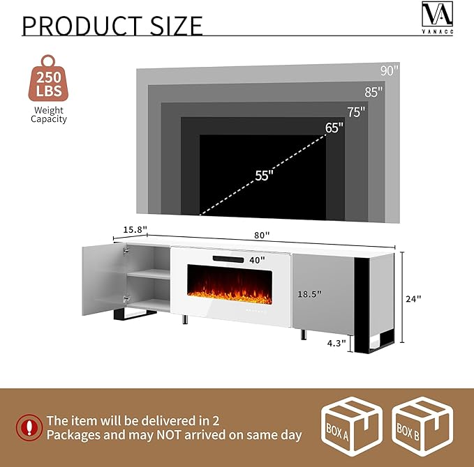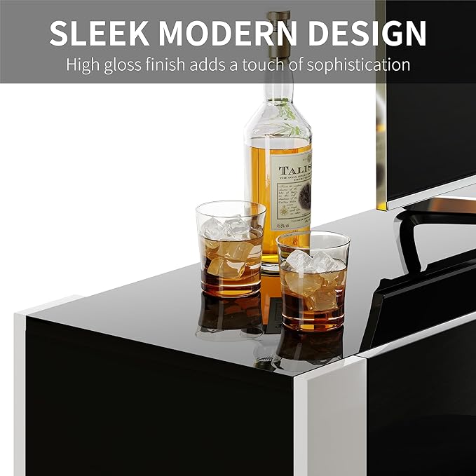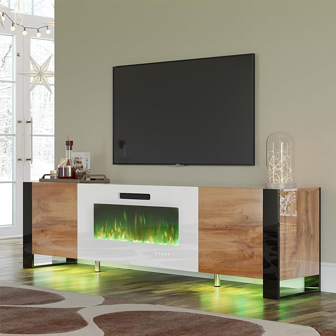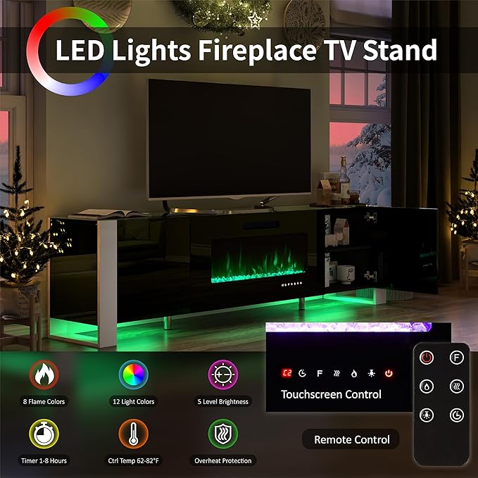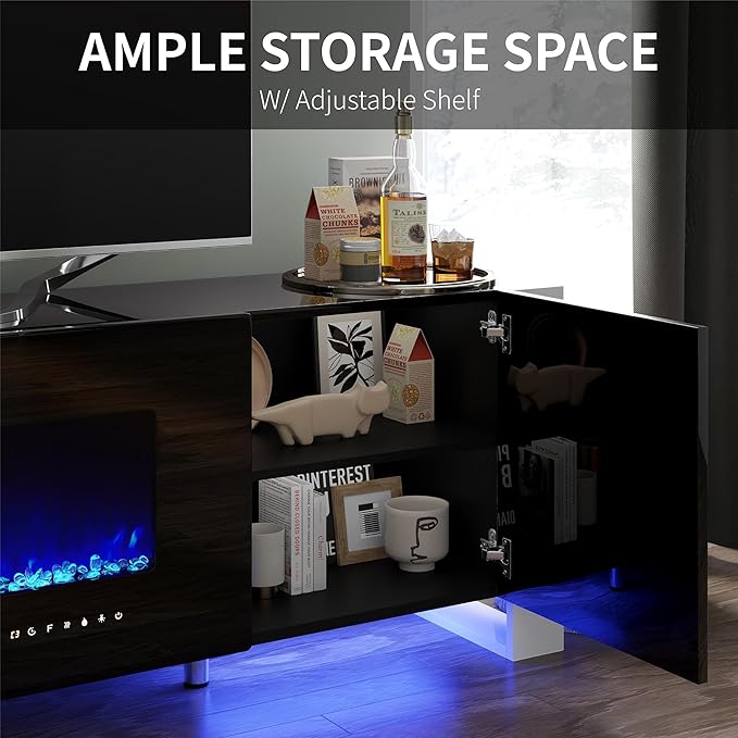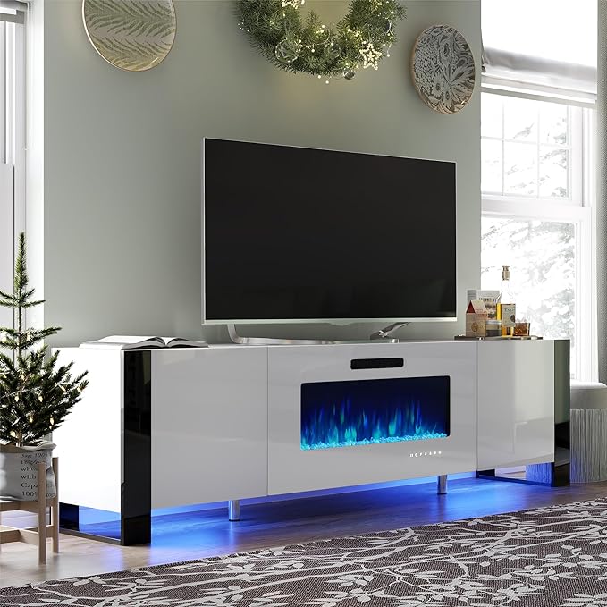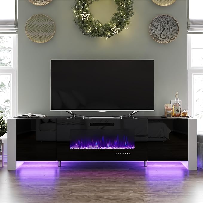 70" Fireplace TV Stand with 36" Electric Fireplace, High Gloss Entertainment Center with LED Lights, Modern Entertainment Stand for TVs up to 80", Black
