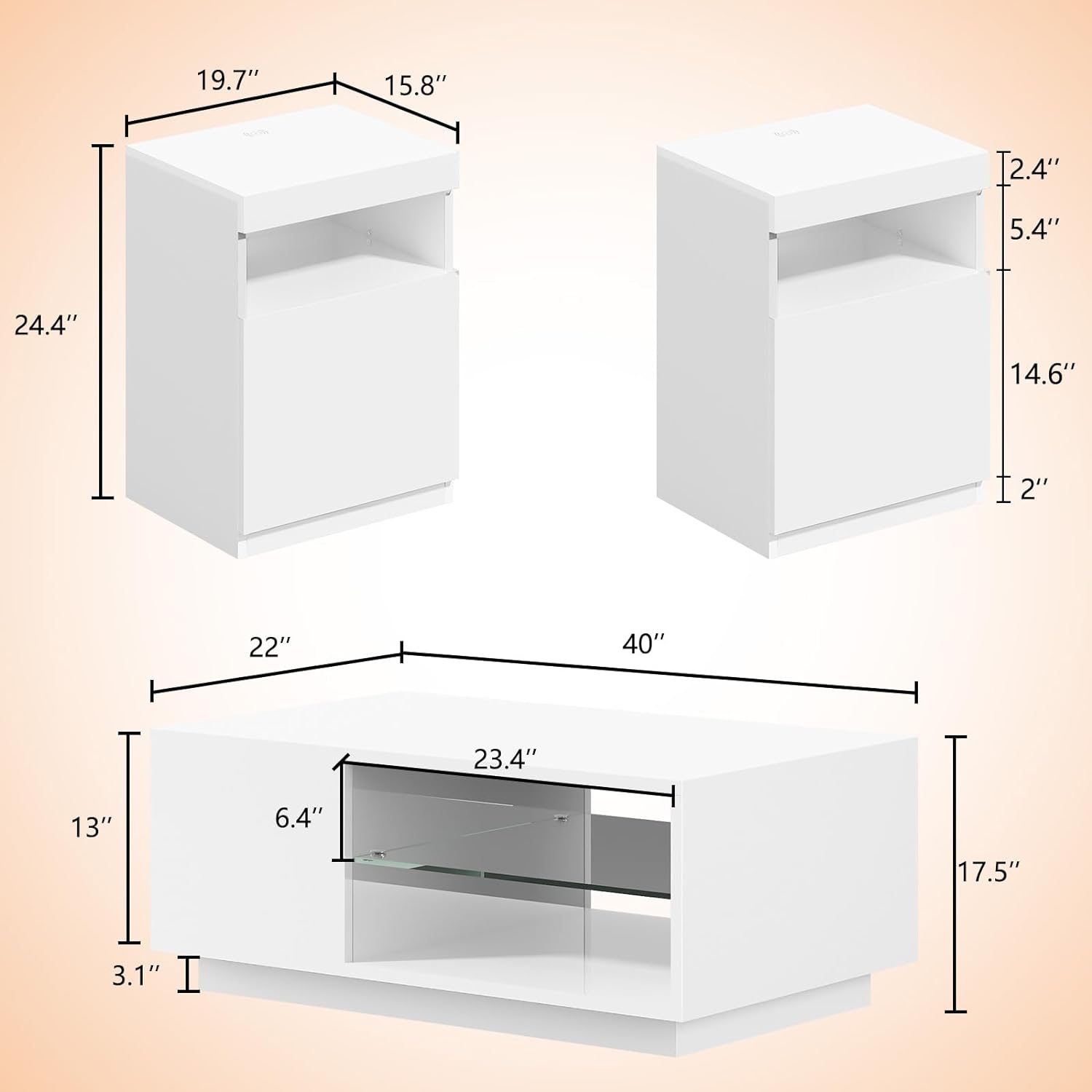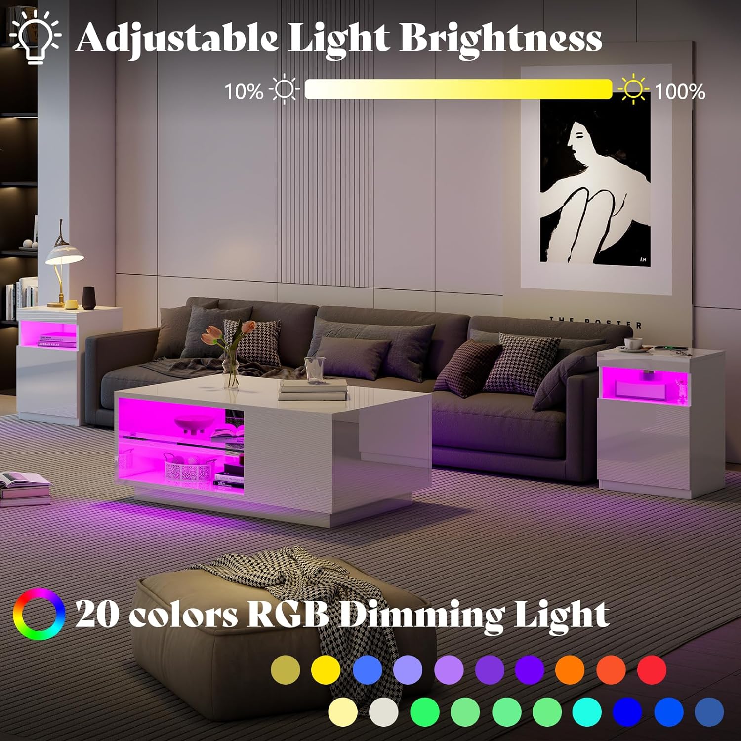 AMERLIFE 3-Piece Modern High Gloss LED Table Set, Coffee Table with 20-Color LED Lights, 2 End Tables with Wireless Charging Station for Living Room & Bedroom