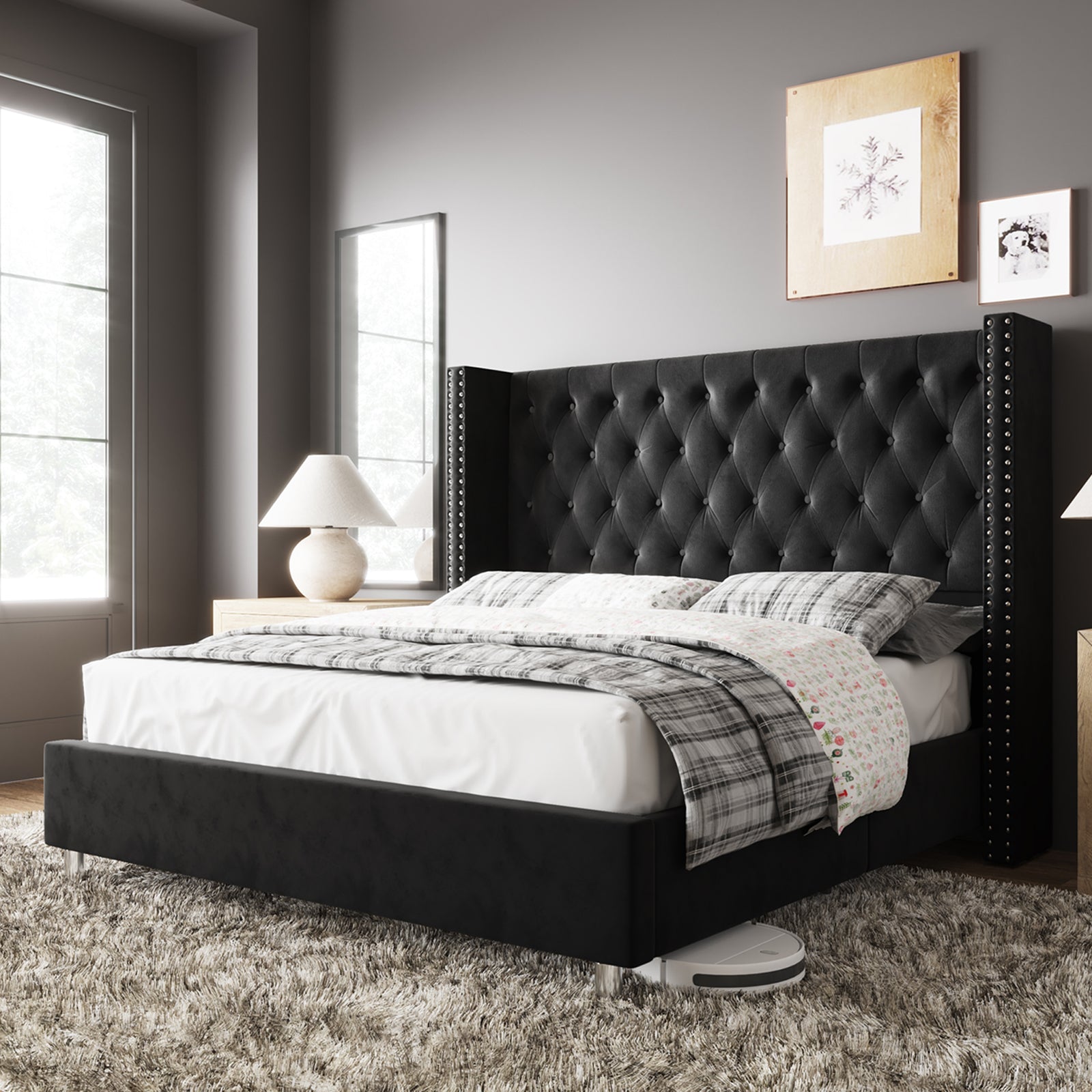 amerlife Bed Frame Upholstered Bed Wingback Headboard Velvet Tufted Diamond Button/No Box Spring Needed/Easy Assembly