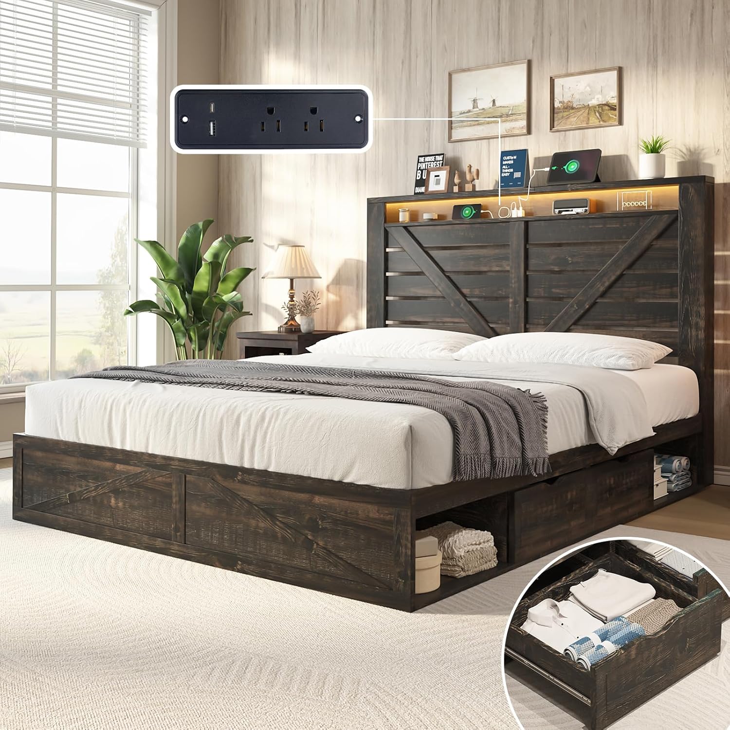 Amerlife Storage Bed Frame with 4 Drawers & LED Light, Charging Station