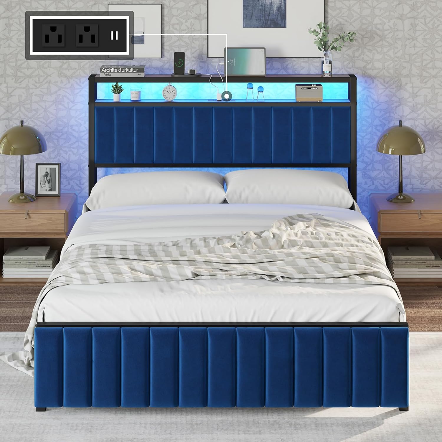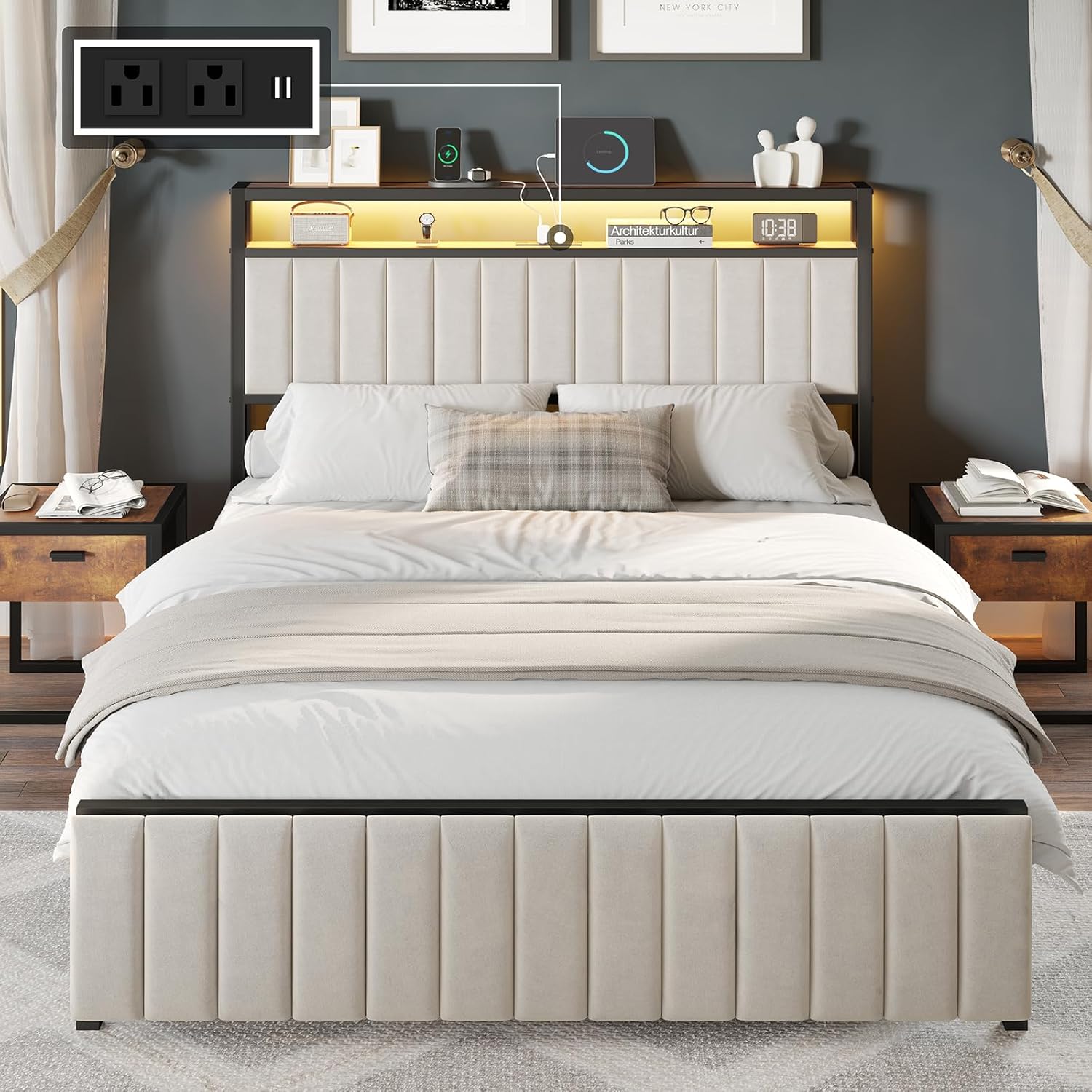 Bed Frame with LED Light and Charging Station, Velvet Upholstered Headboard with Storage Shelf, Heavy Duty Metal Slats/No Box Spring Needed/Easy Assembly