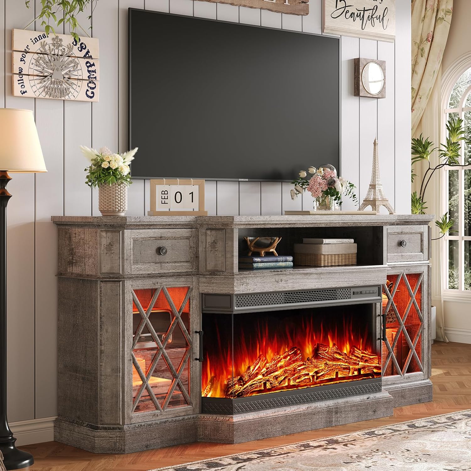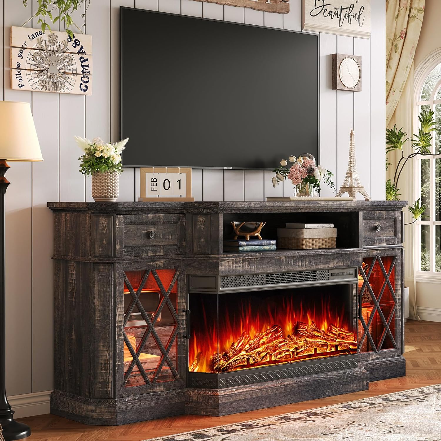 Bevel 3-Sided Glass Farmhouse Fireplace TV Stand with 36" Fireplace, 70" LED Lights Entertainment Center Glass Doors & Drawers, TV Cabinet Console Table for TVs Up to 80", Living Room