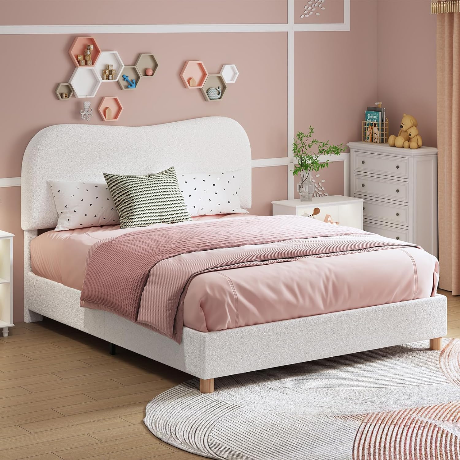 Boucle Bed Frames, Upholstered Platform Bed with Curved Shaped Headboard, Soft Rounded Corners, Noise Free, Easy Assembly