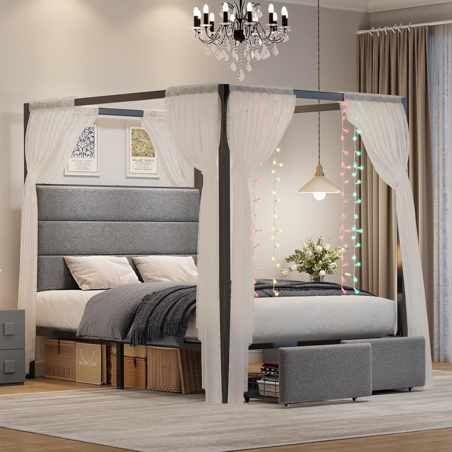 Canopy Bed Frame with Upholstered Panel Headboard, Lamb Wool Tufted Metal Platform Bed with 2 Drawers & 4 Posts, 12 Metal Slats Mattress Foundation, No Box Spring Needed