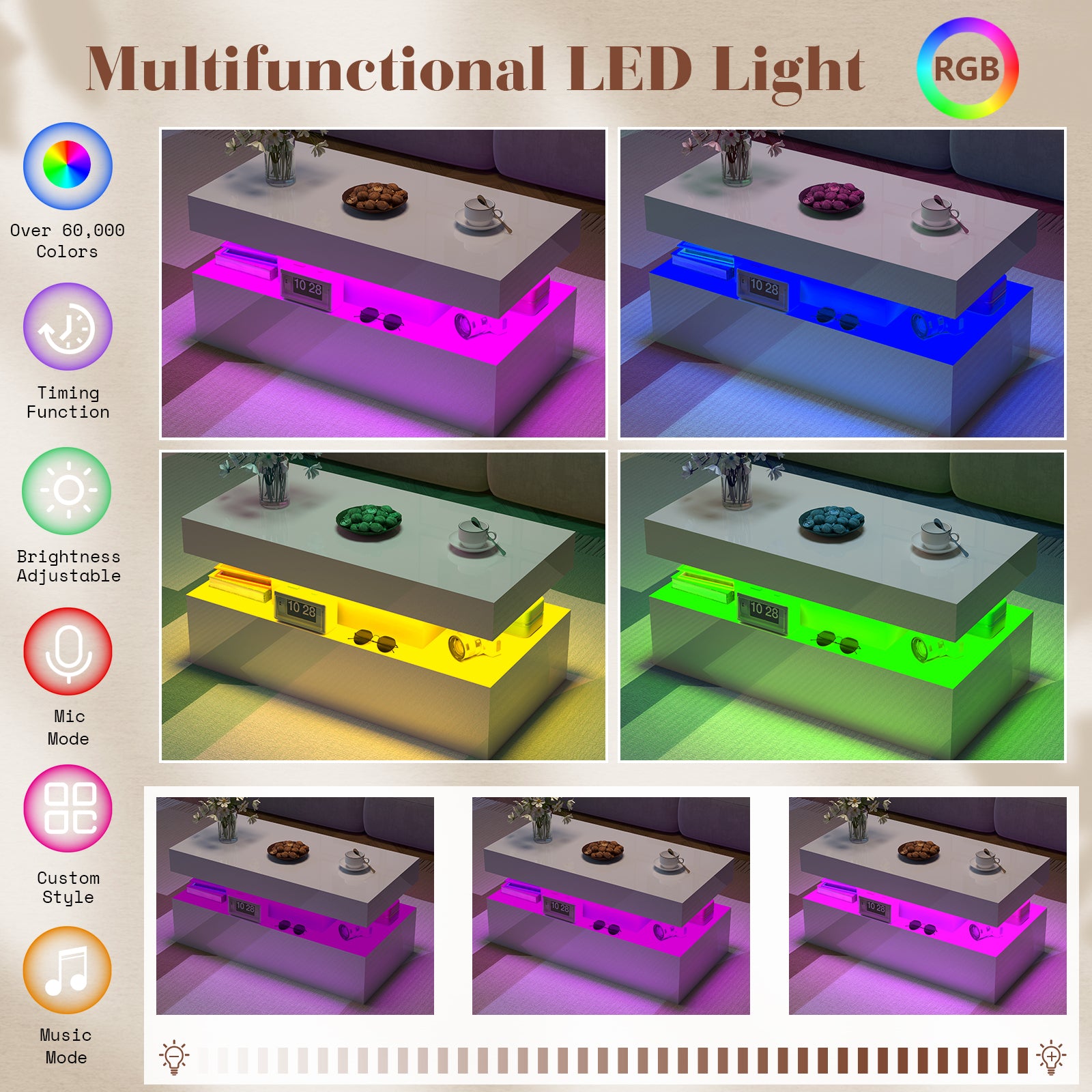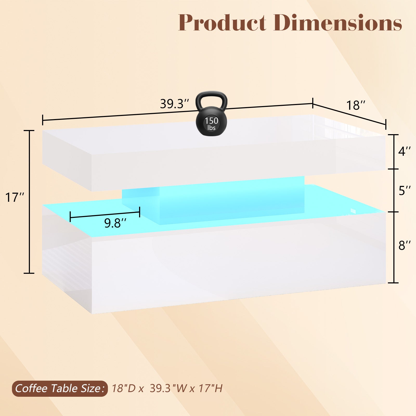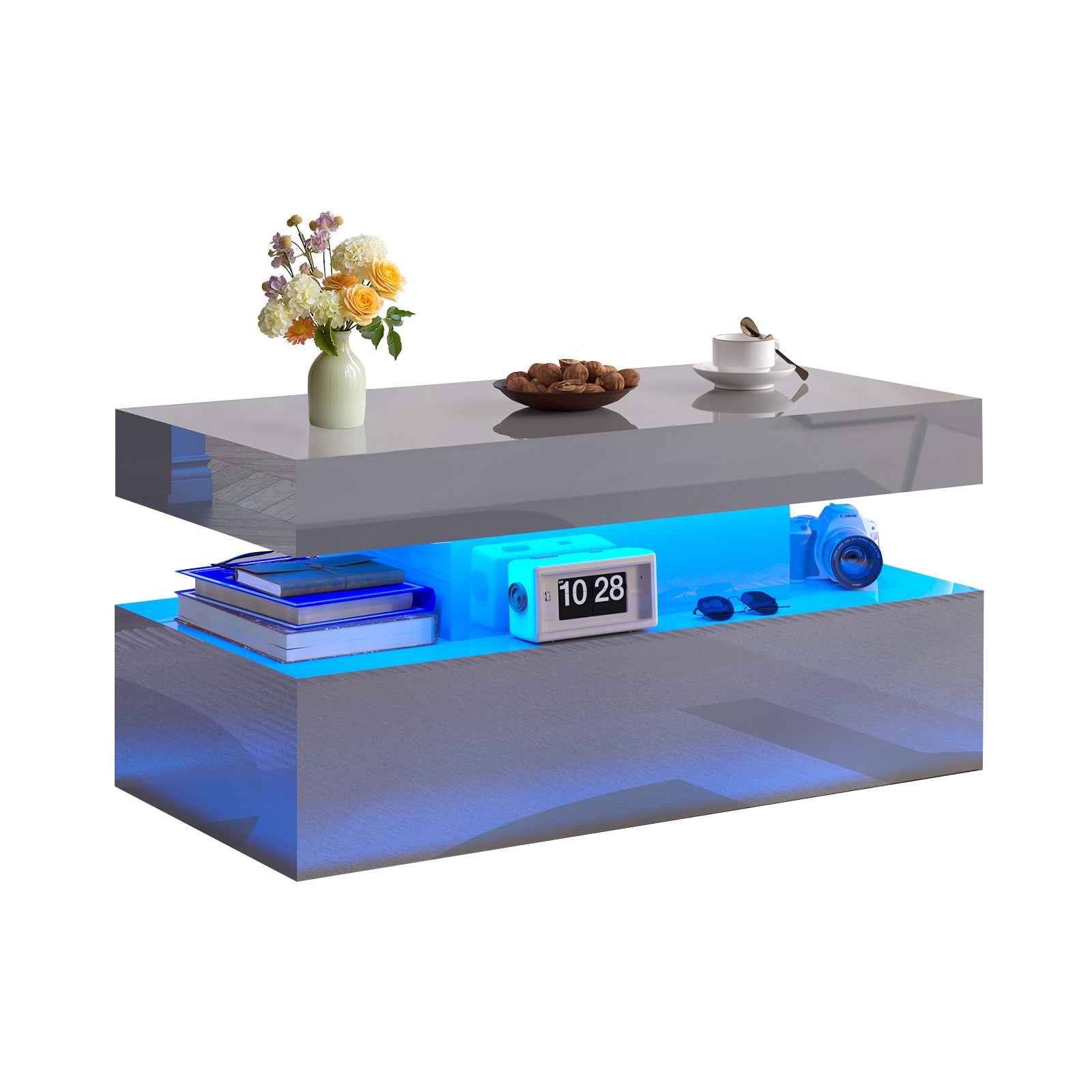 Coffee Table with LED Light, Modern High Gloss Finish Center Table with 2-Tier Storage Space, Minimalist Coffee Table for Living Room, Office, Black