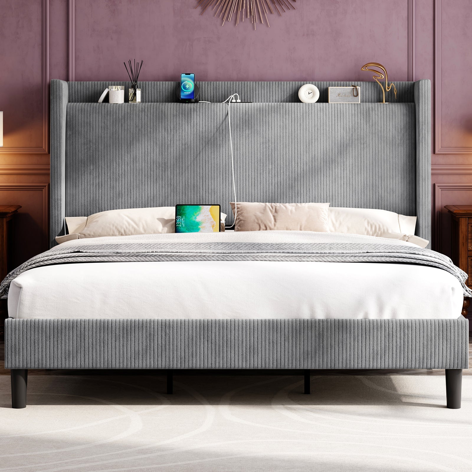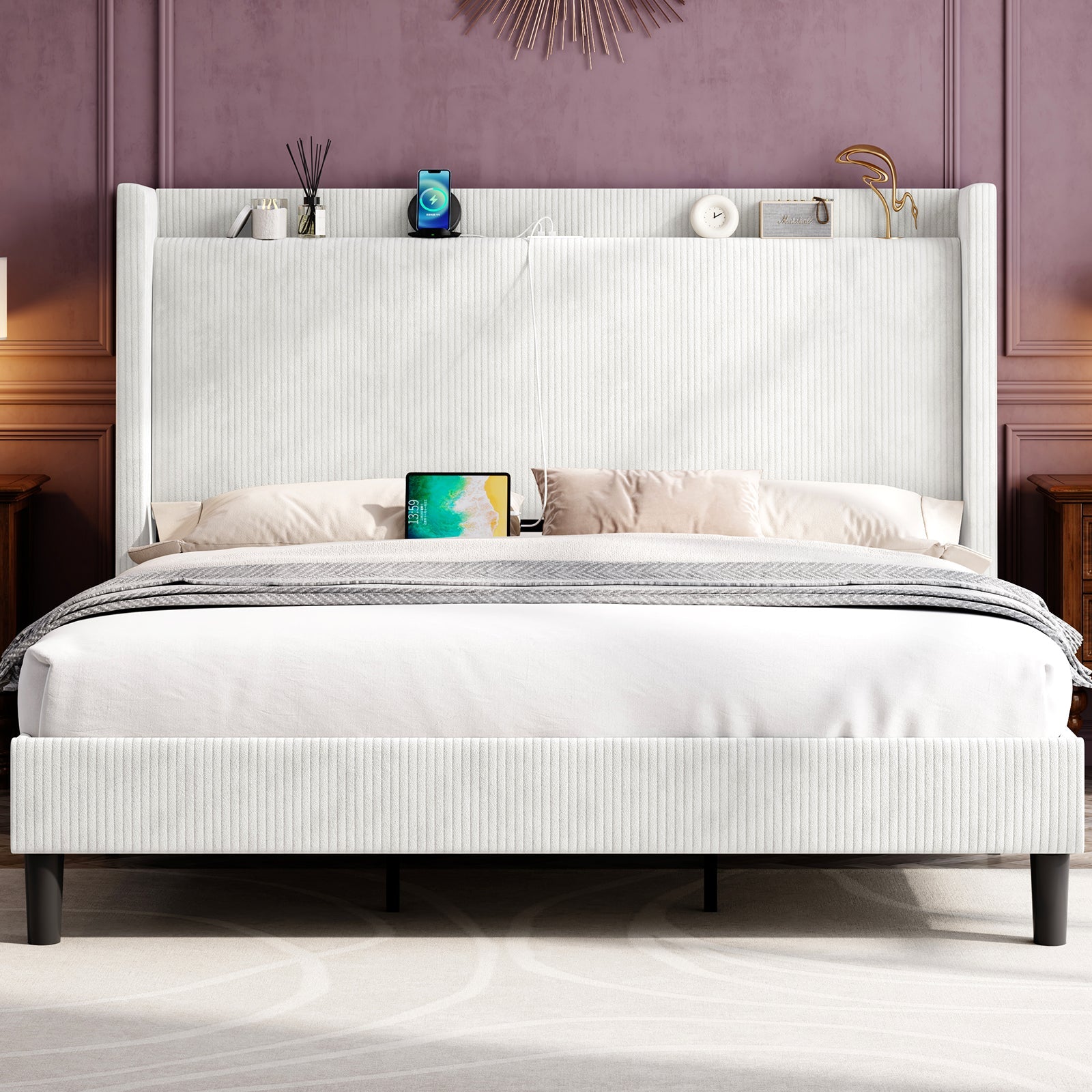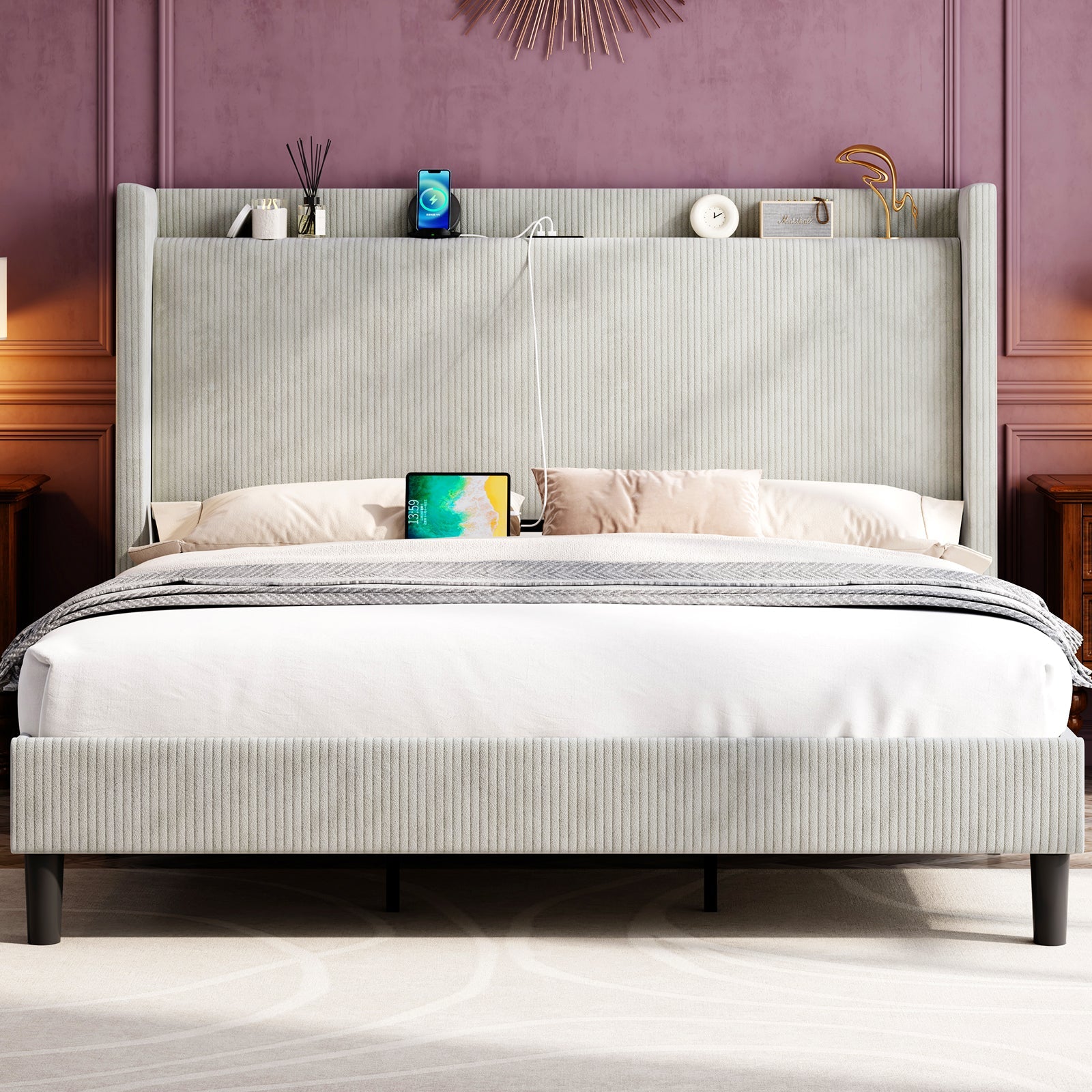 Corduroy Upholstered Bed Frame with Modern Wingback Storage Headboard, Charging Station