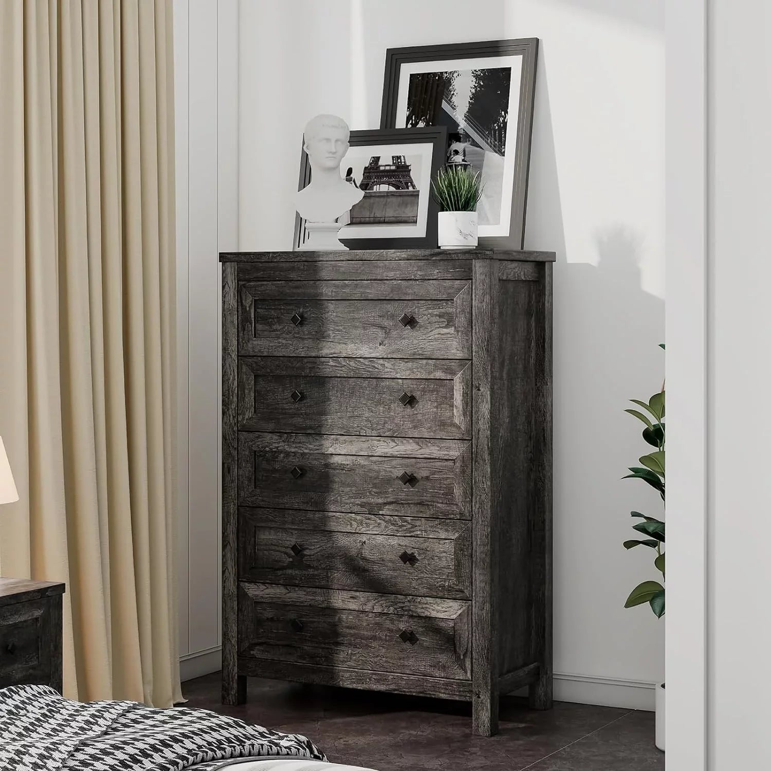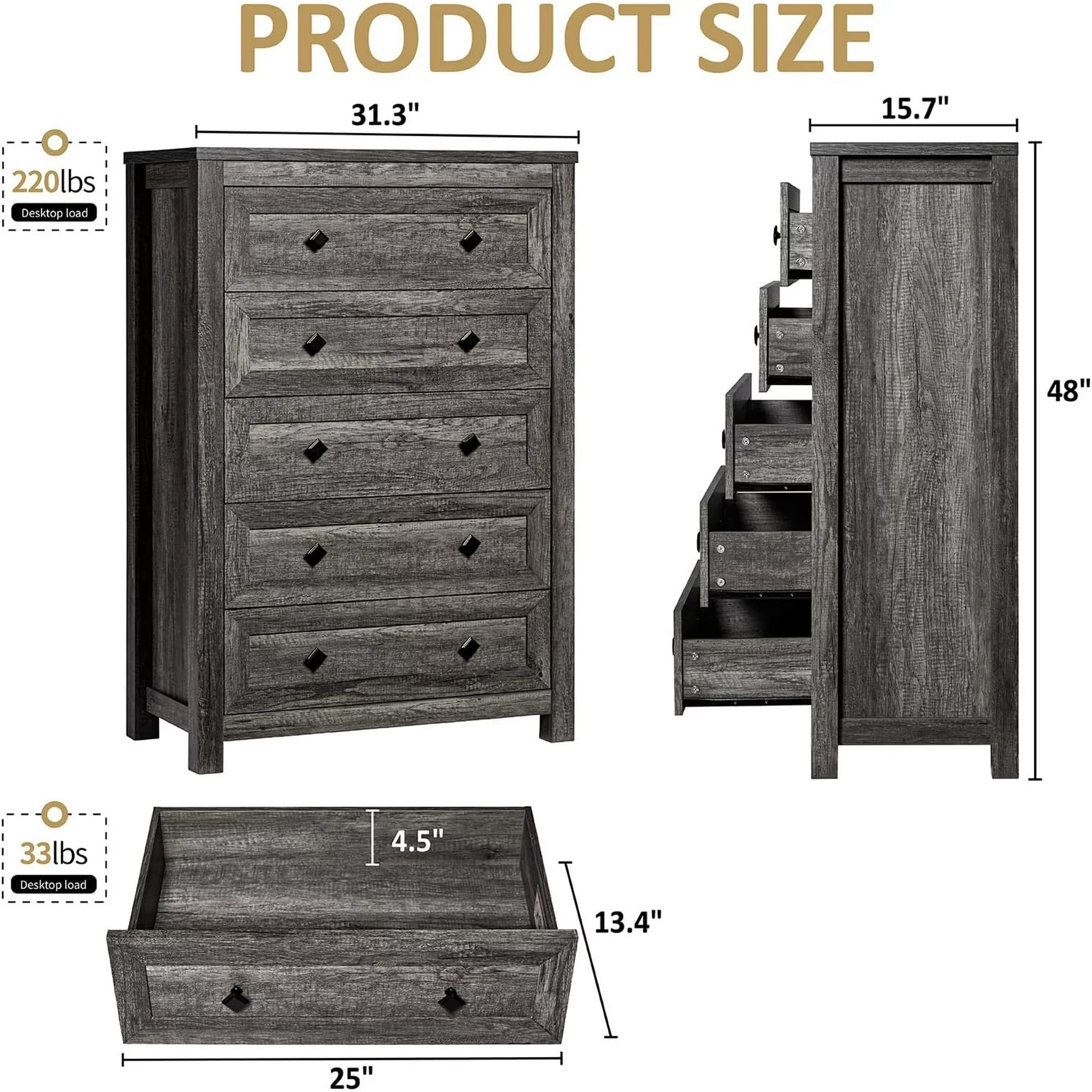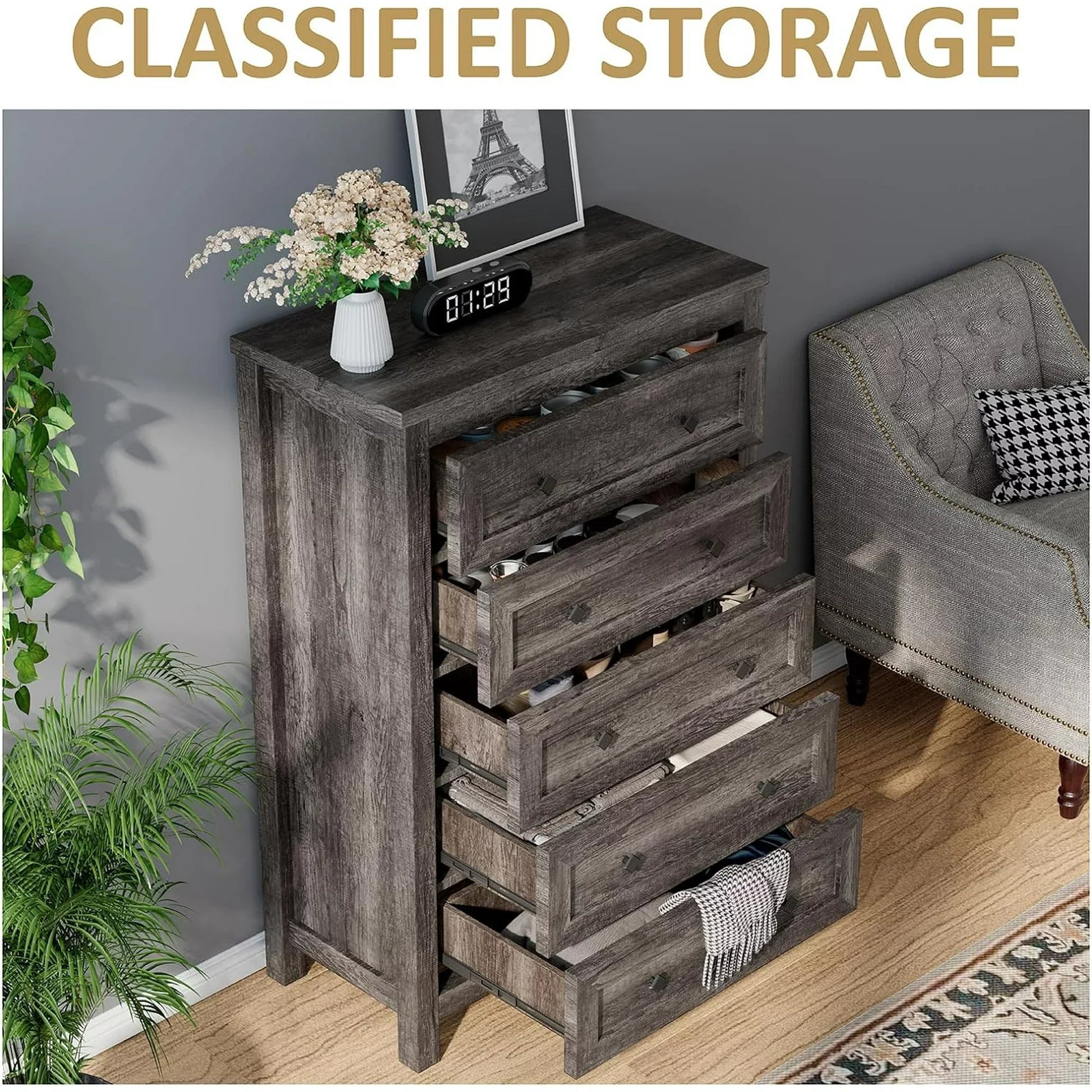 Farmhouse 5 Drawers Dresser, Wood Chest of Drawers for Bedroom, Living Room, Washed Ash