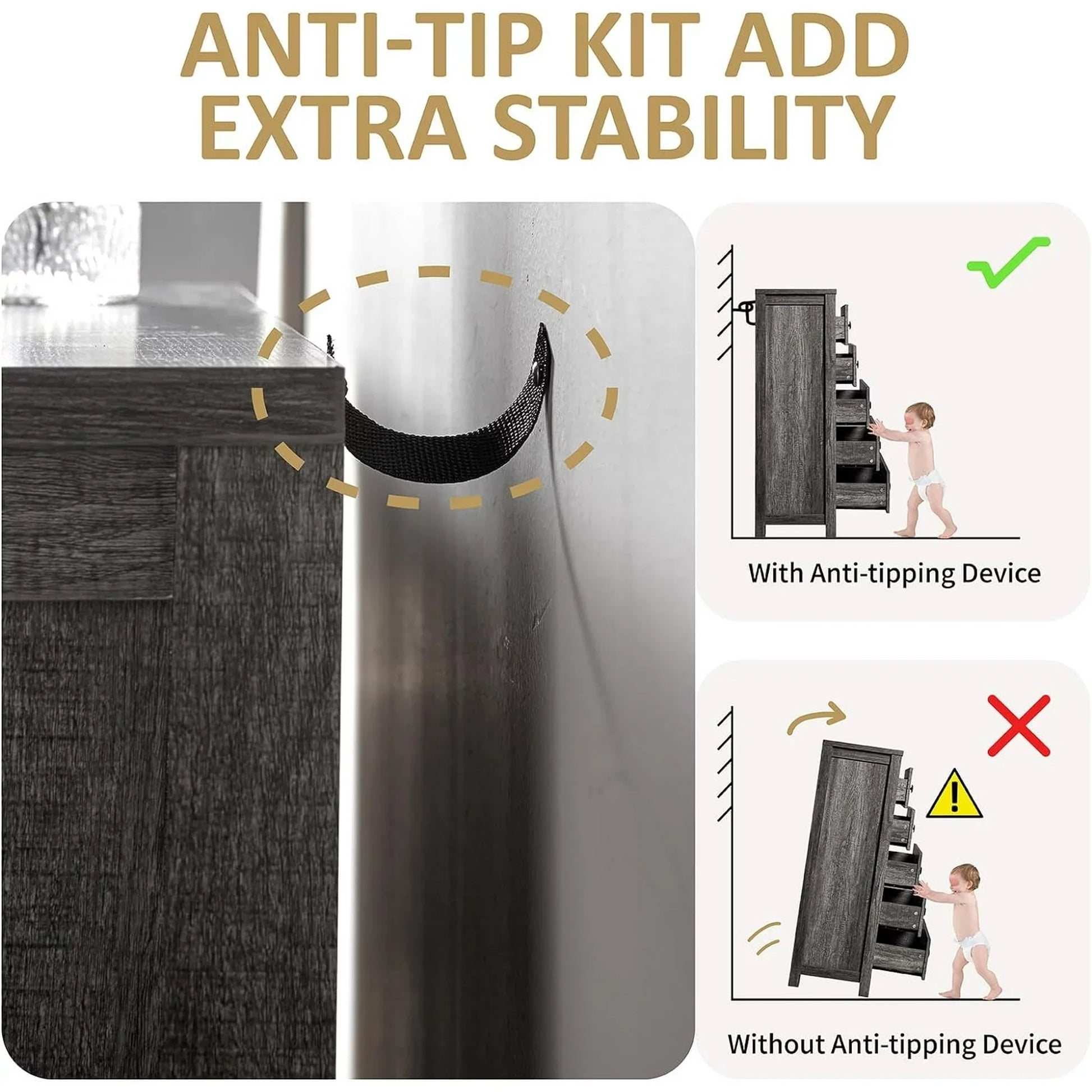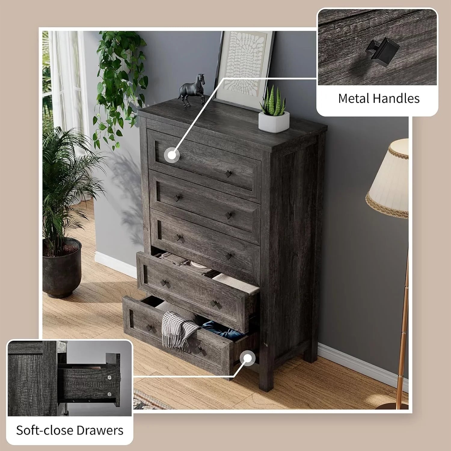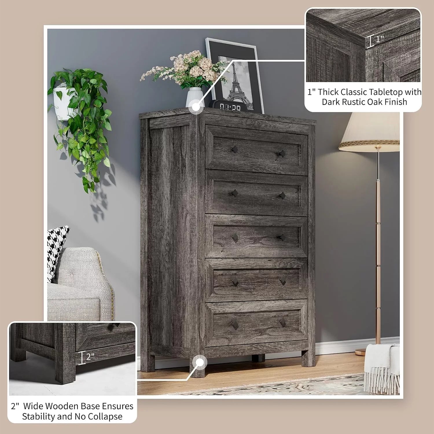 Farmhouse 5 Drawers Dresser, Wood Chest of Drawers for Bedroom, Living Room, Washed Ash