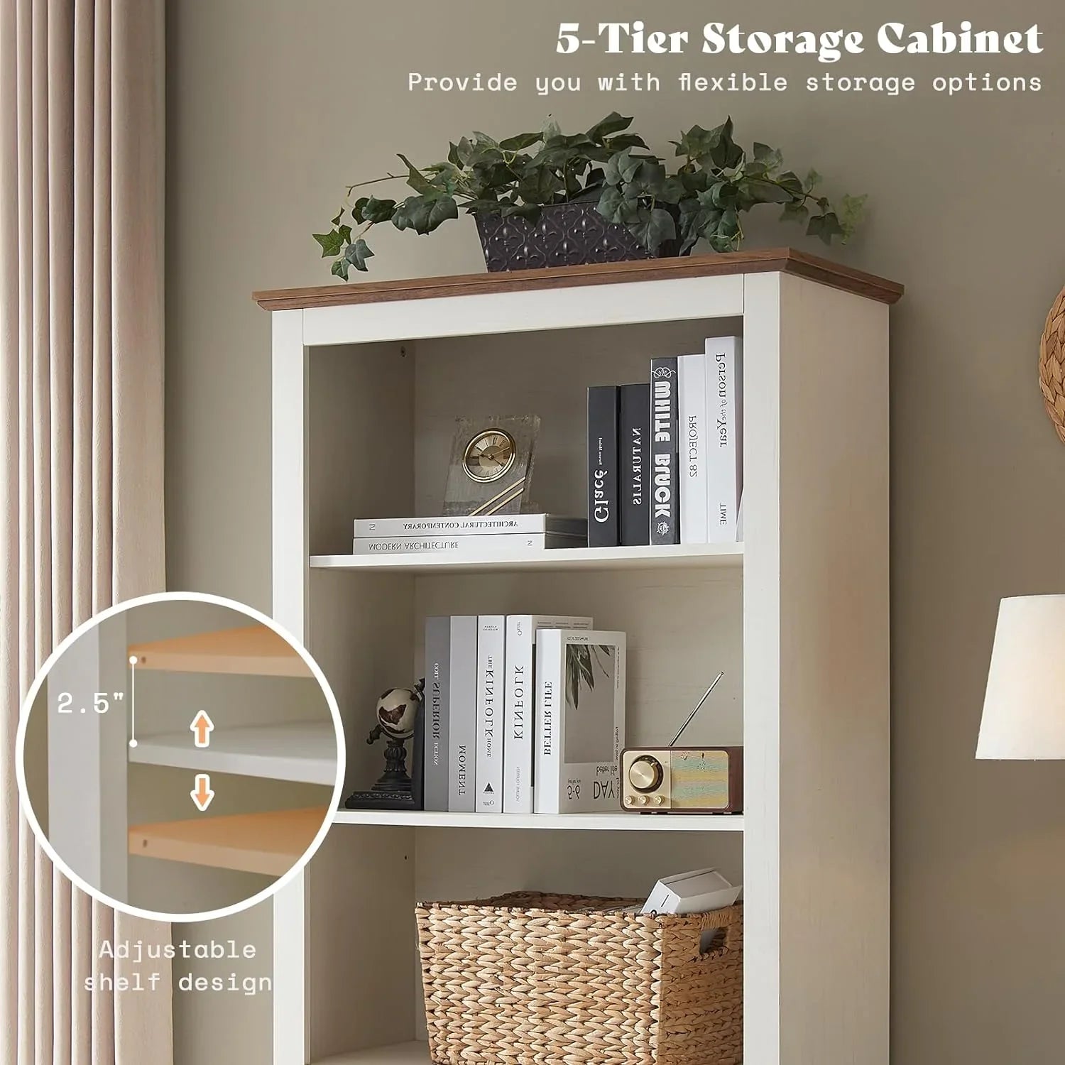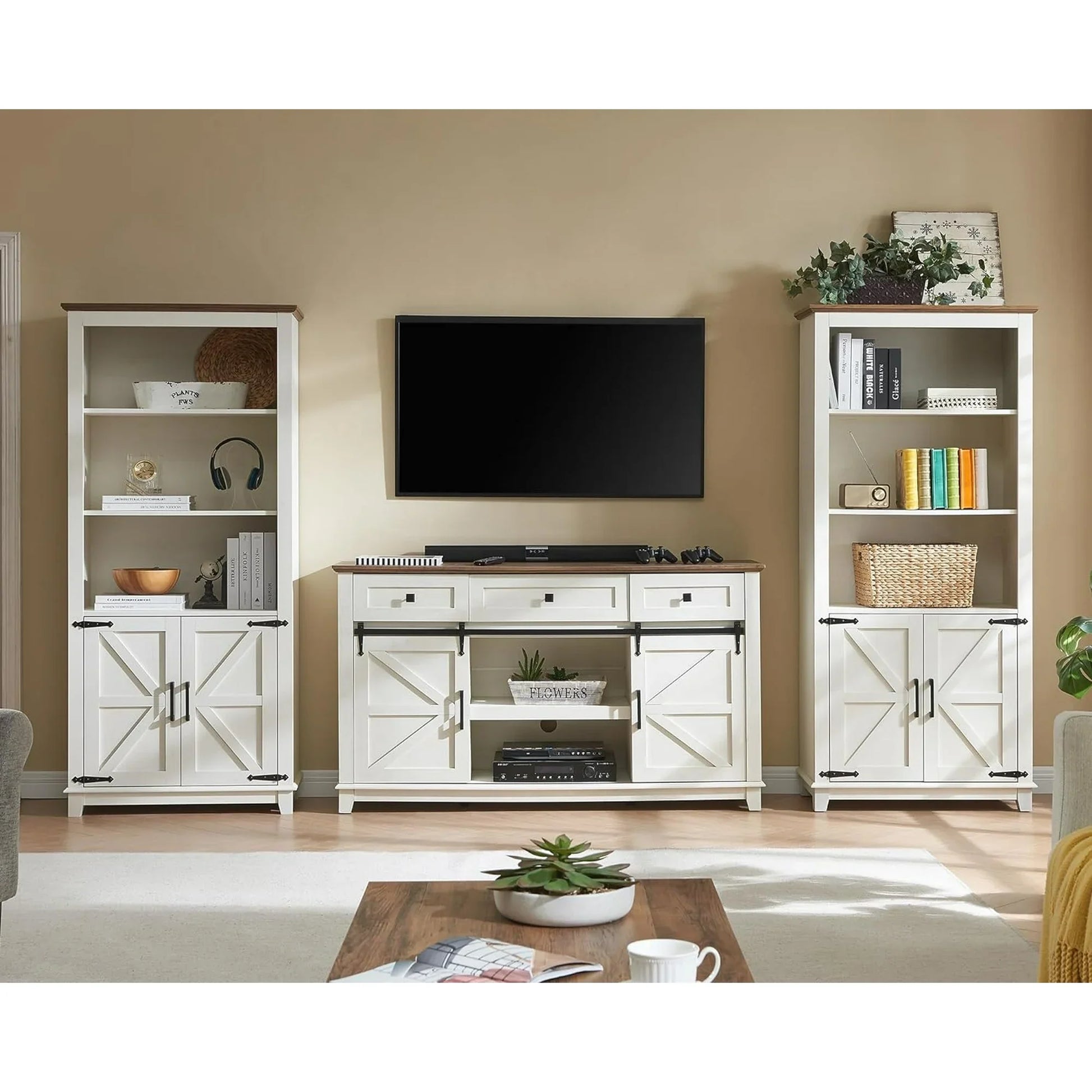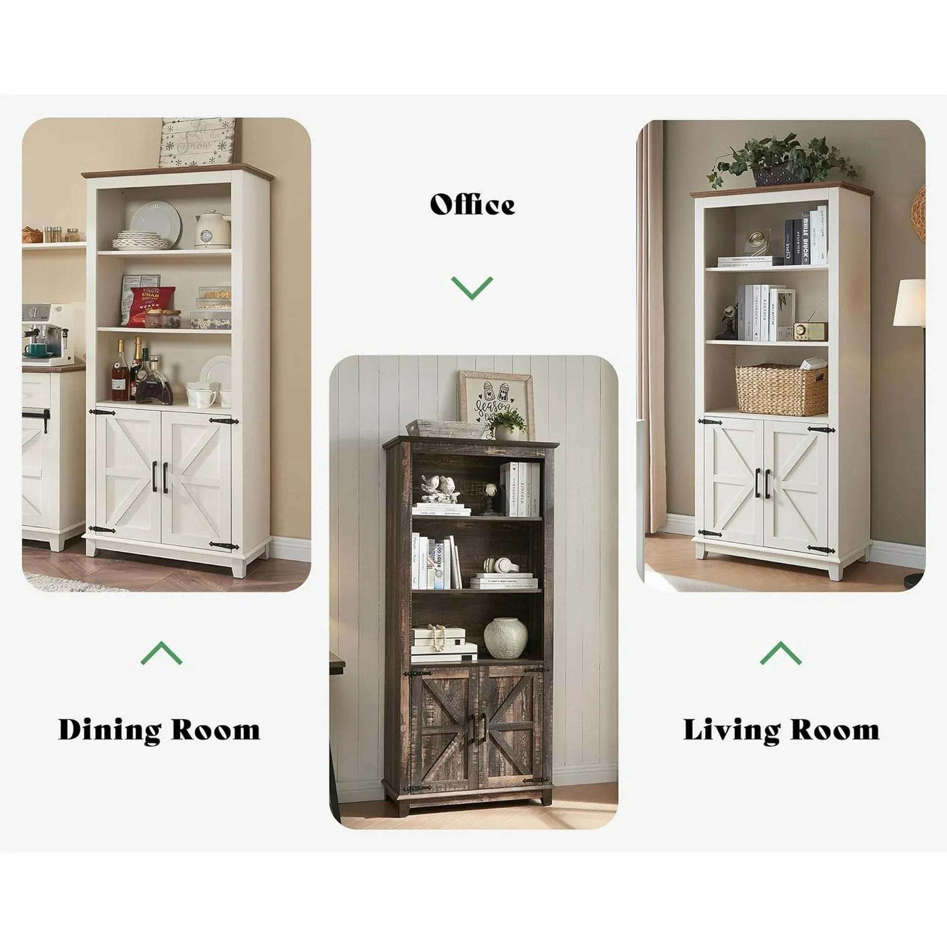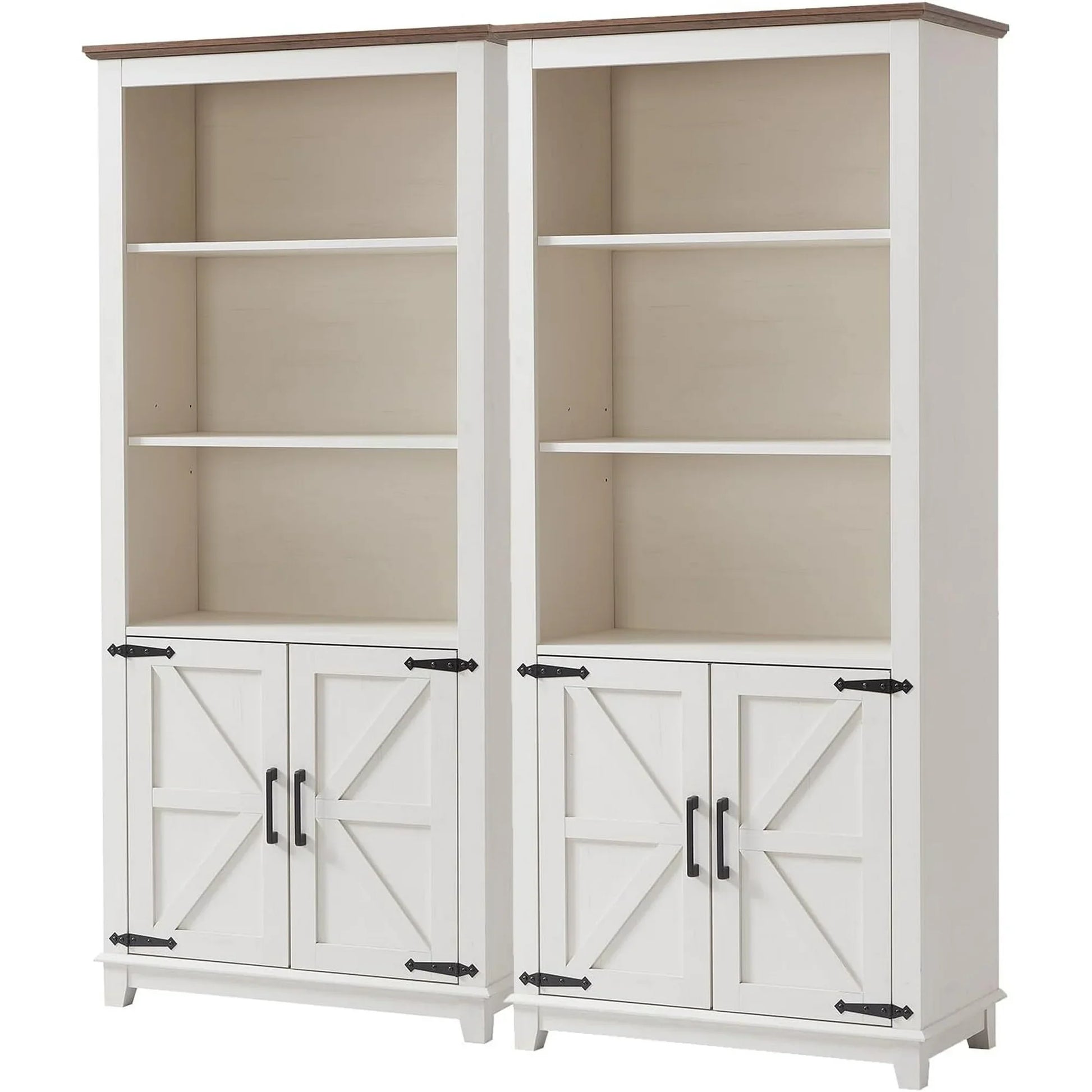 Farmhouse Bookcase with Doors, 5 Shelf Bookshlf Storage Cabine with Adjustable Shelves & Barn Door, Versatile Storage Pantry Cabinet for Bedroom, Living Room, Kitchen, Rustic White