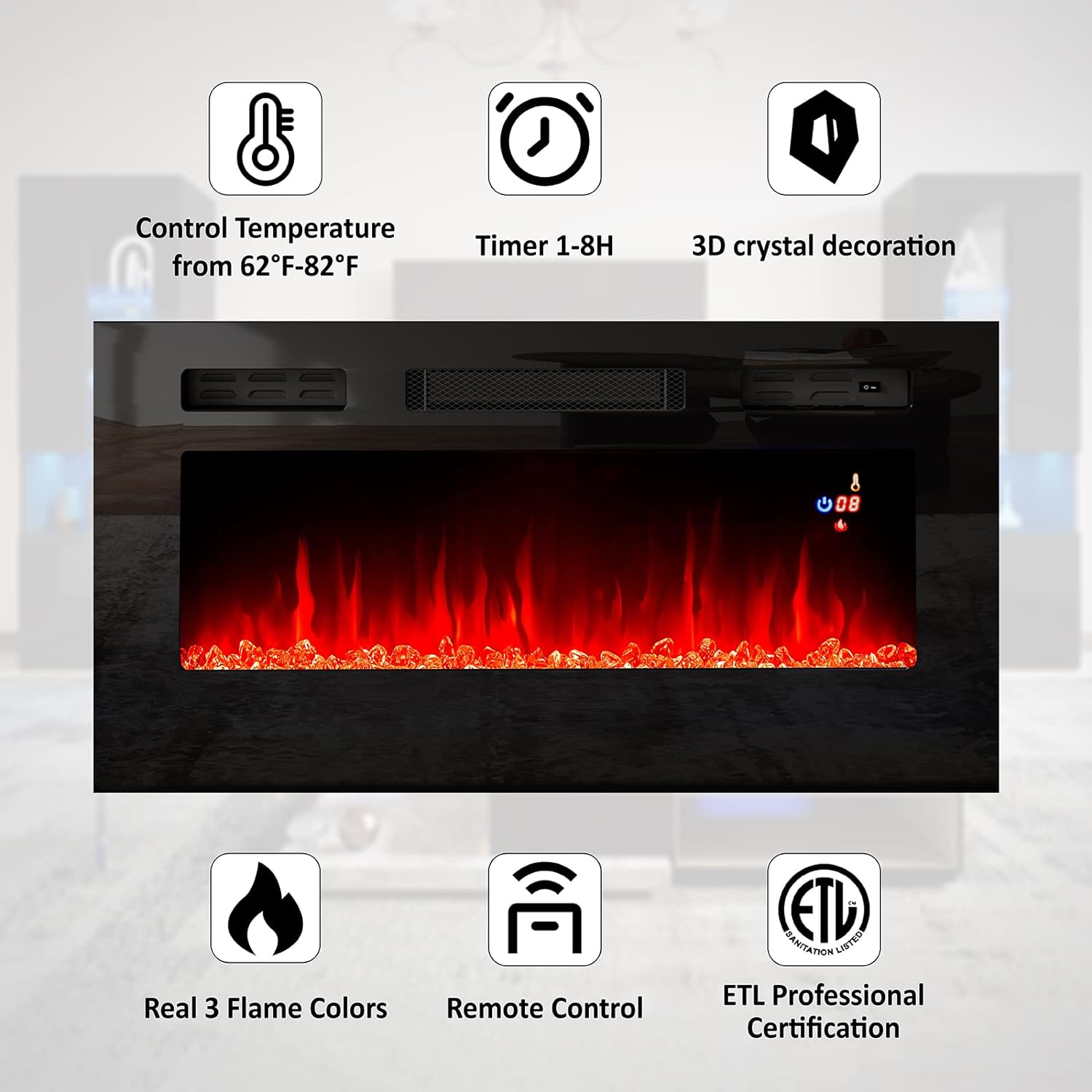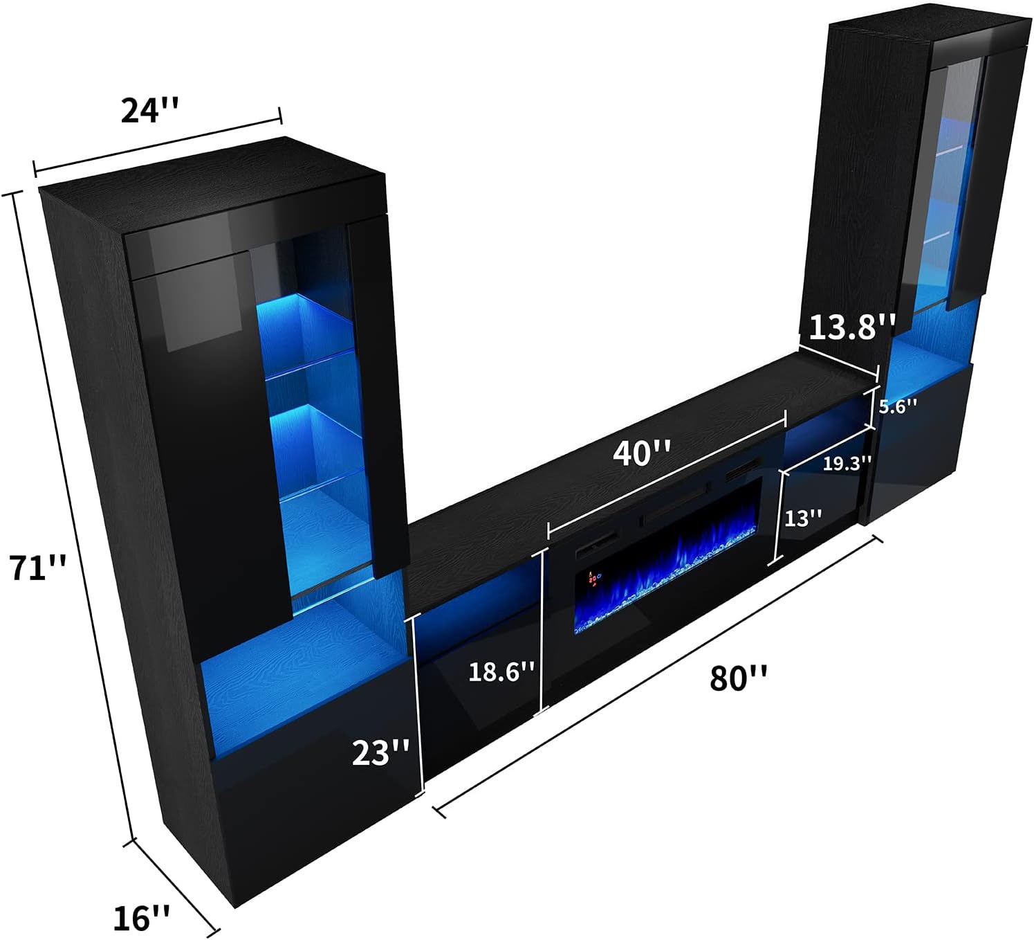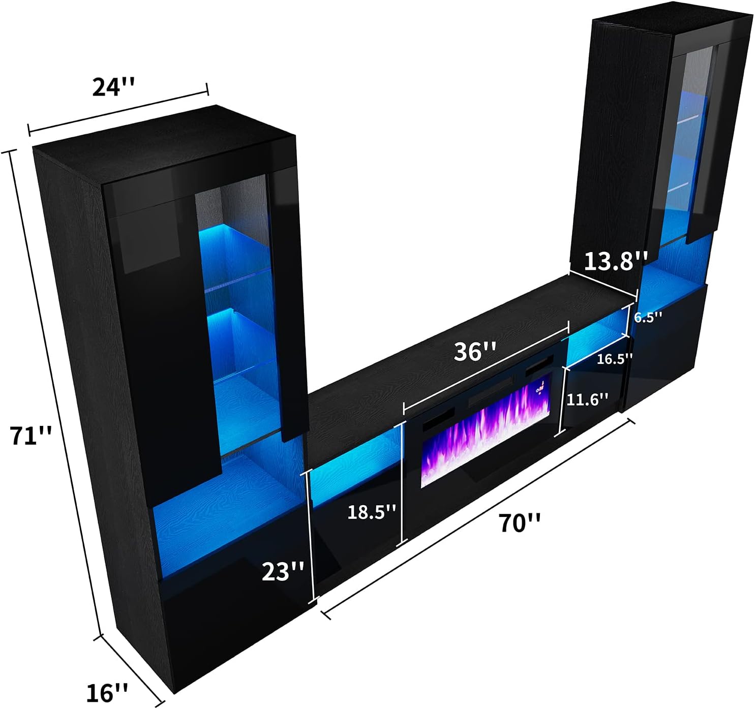 Fireplace Entertainment Center Set, includes 70" Fireplace TV Stand & 2 LED Highgloss Bookcases, Modern Storage Cabinets for TVs up to 80", Black