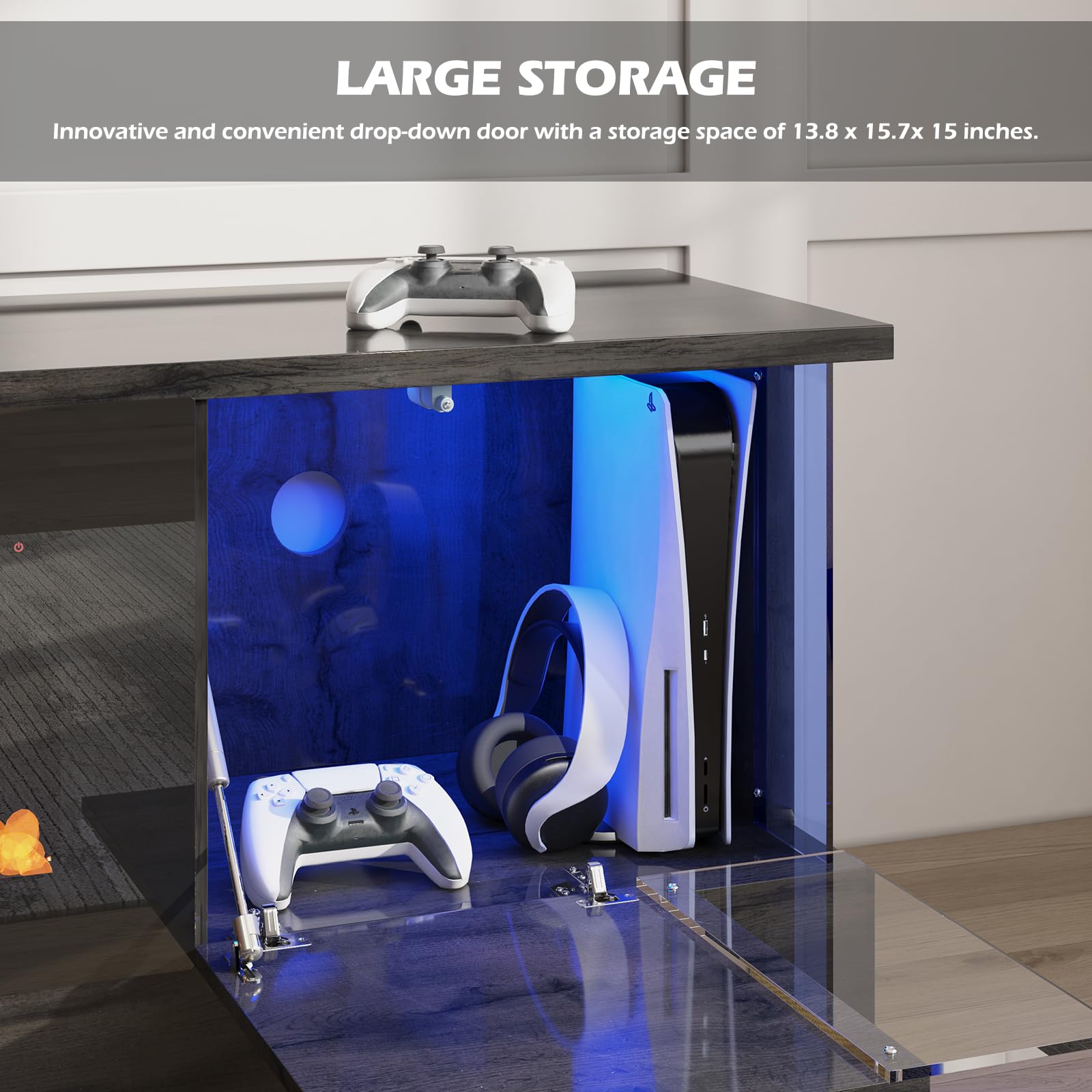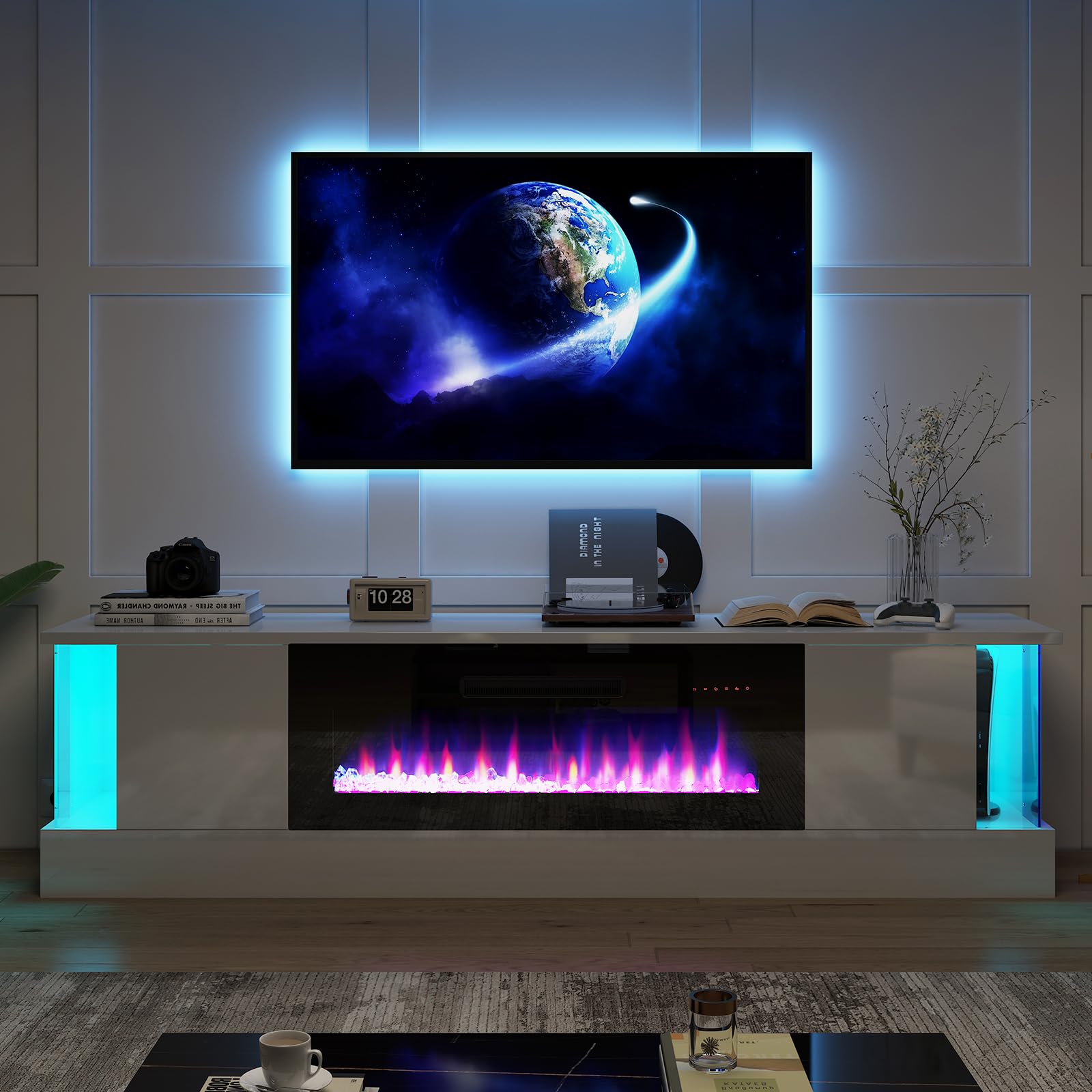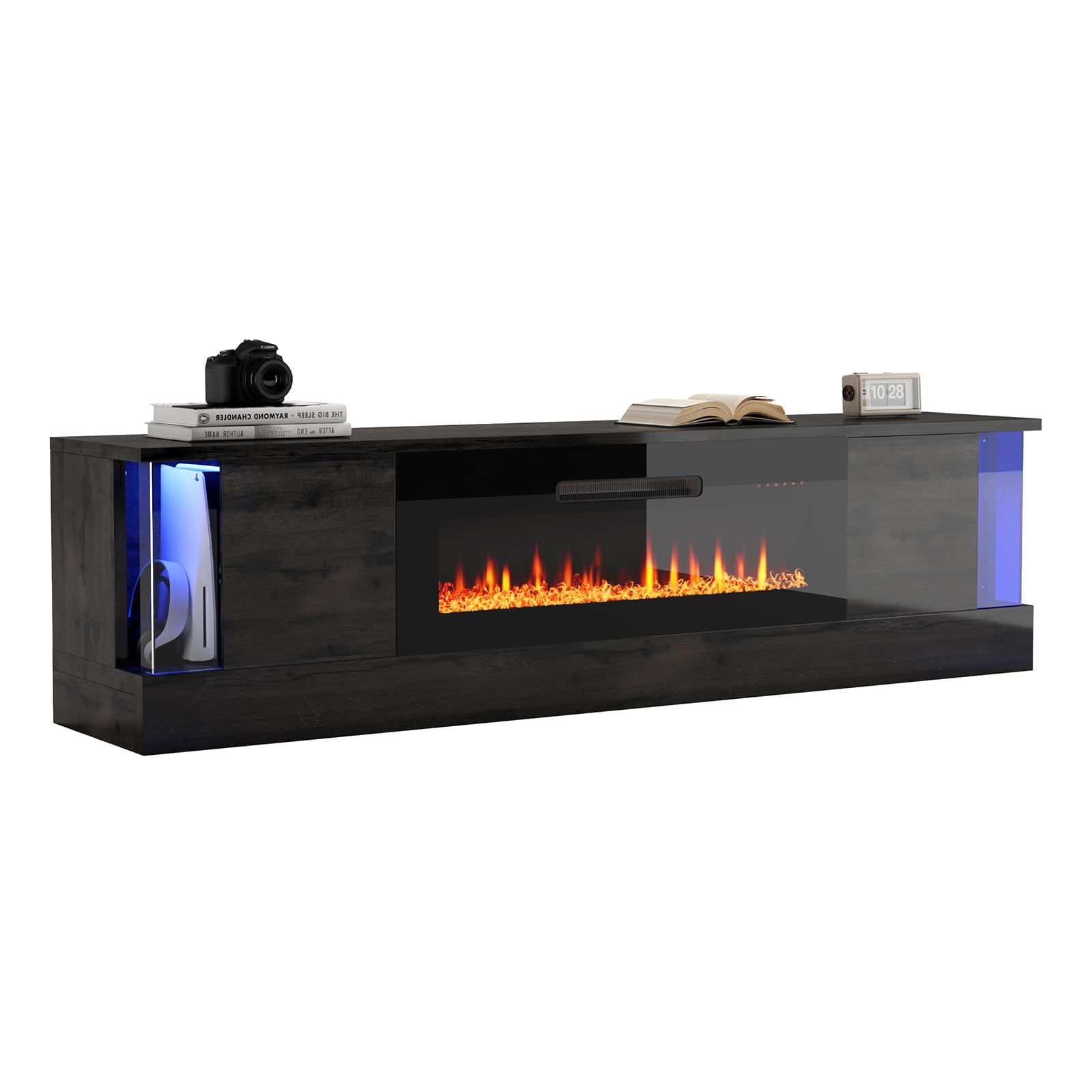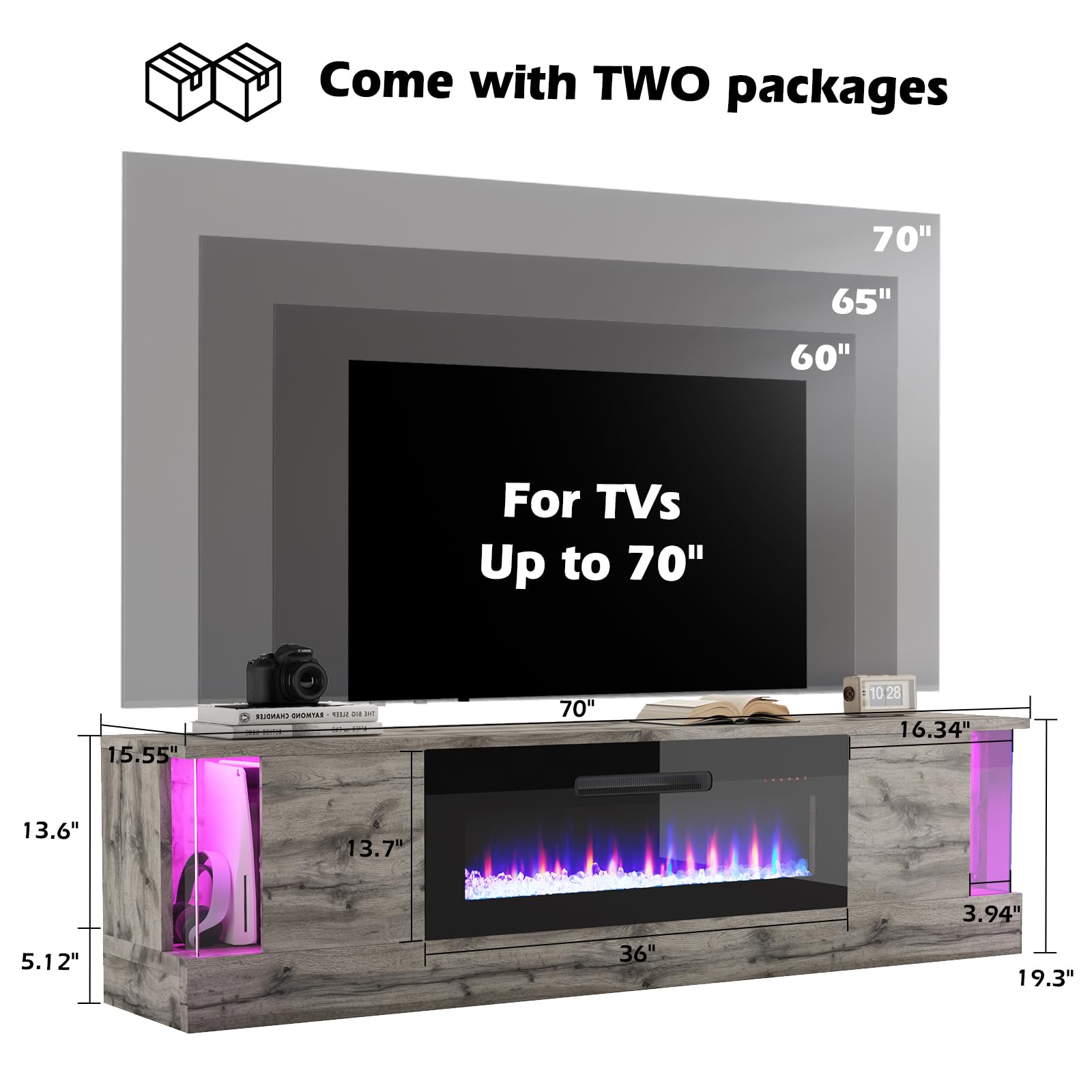 Fireplace TV Stand with 36" Electric Fireplace, 70" Modern Wood Grain High-Gloss TV Cabinet for Living Room, LED Entertainment Center with Flip-Down Doors for TVs up to 70", Black