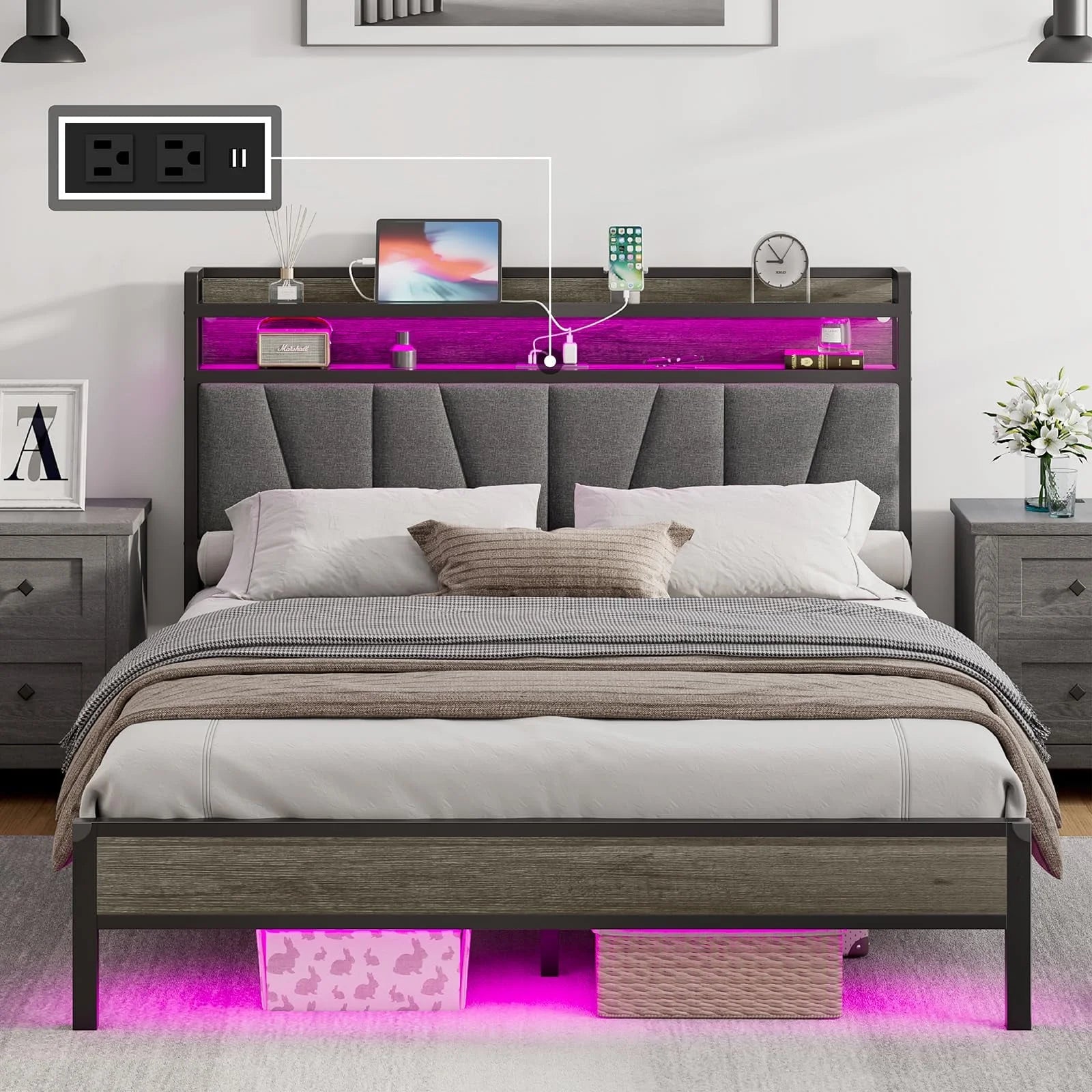 Bed Frame with RGBW LED Lights & Charging Station, Linen Upholstered Headboard with 2-Tier Storage, Stable Metal Platform, No Box Spring Needed/Noise-Free