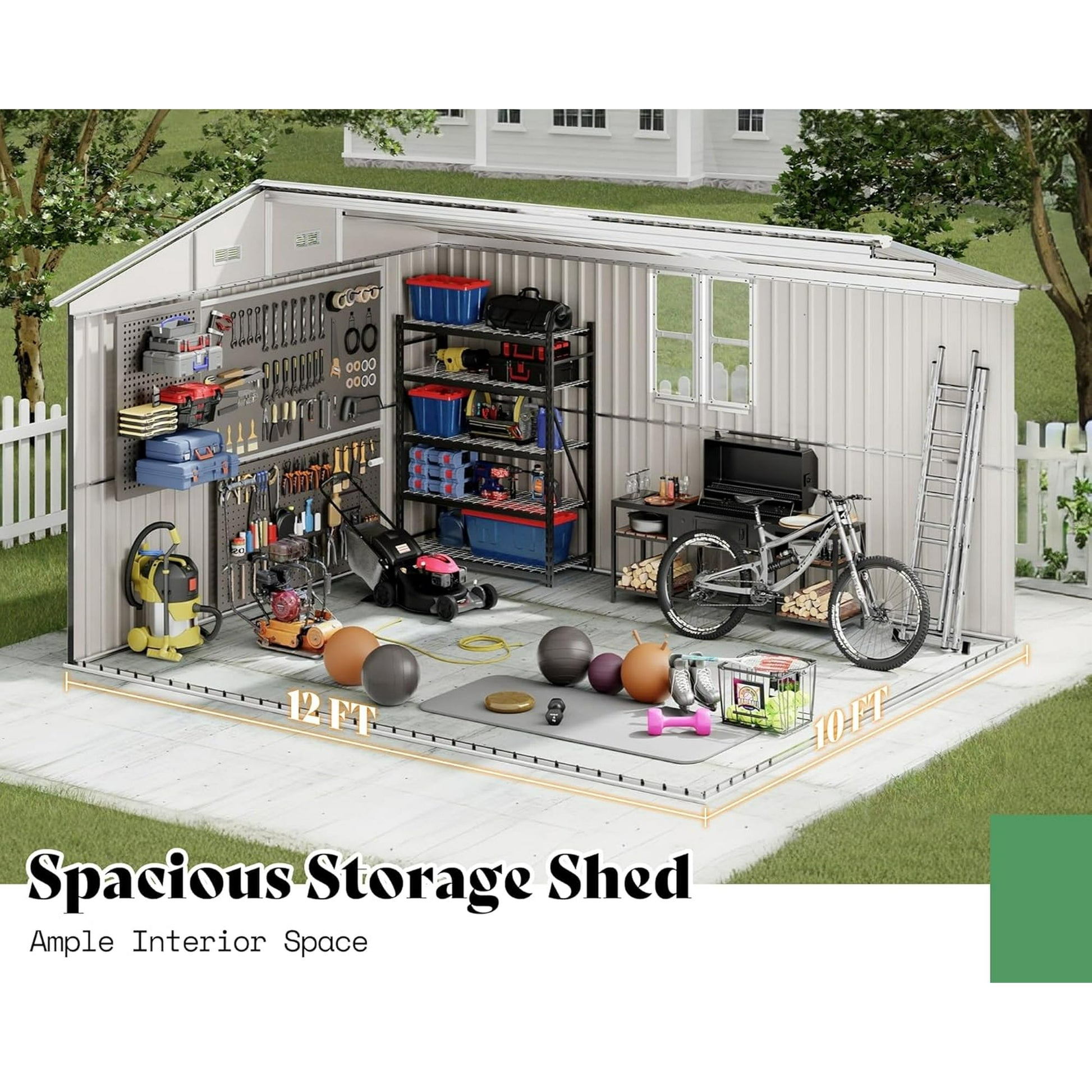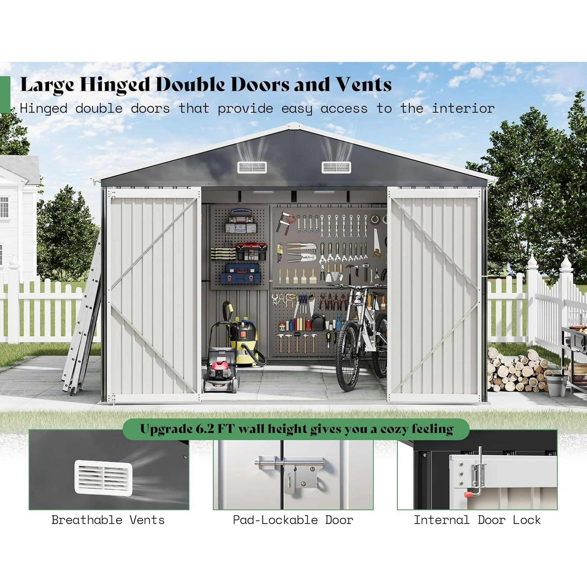 Jocisland 10x12x7 FT Galvanized Steel Storage Shed with 2 4-Pane Windows Hinged Double Doors, Outdoor Shed for Backyard, Garden, Garden, Dark Grey/White
