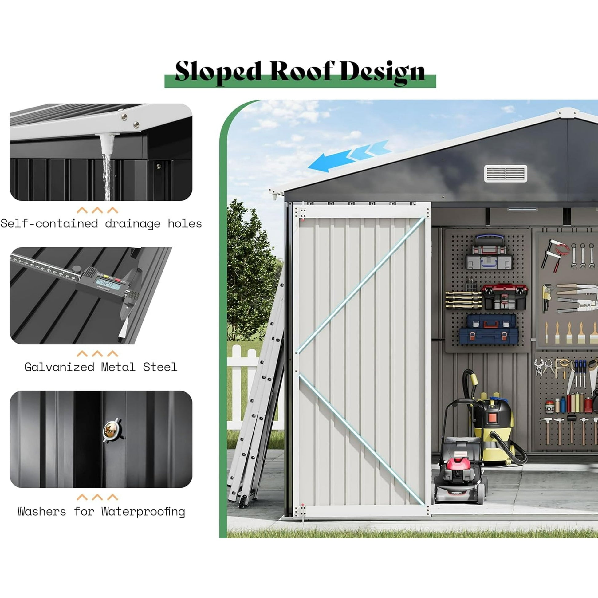 - Outdoor Waterproof Shed: The galvanized steel metal shed is 0.25mm thick. Reinforced roof beams and drainage holes ensure it can resist winds and rainfall. All screws are equipped with washers for waterproofing
