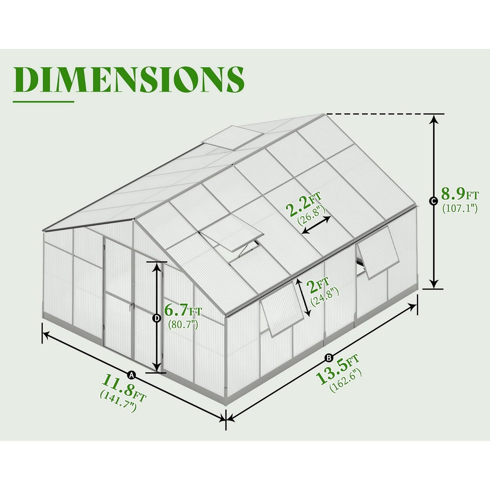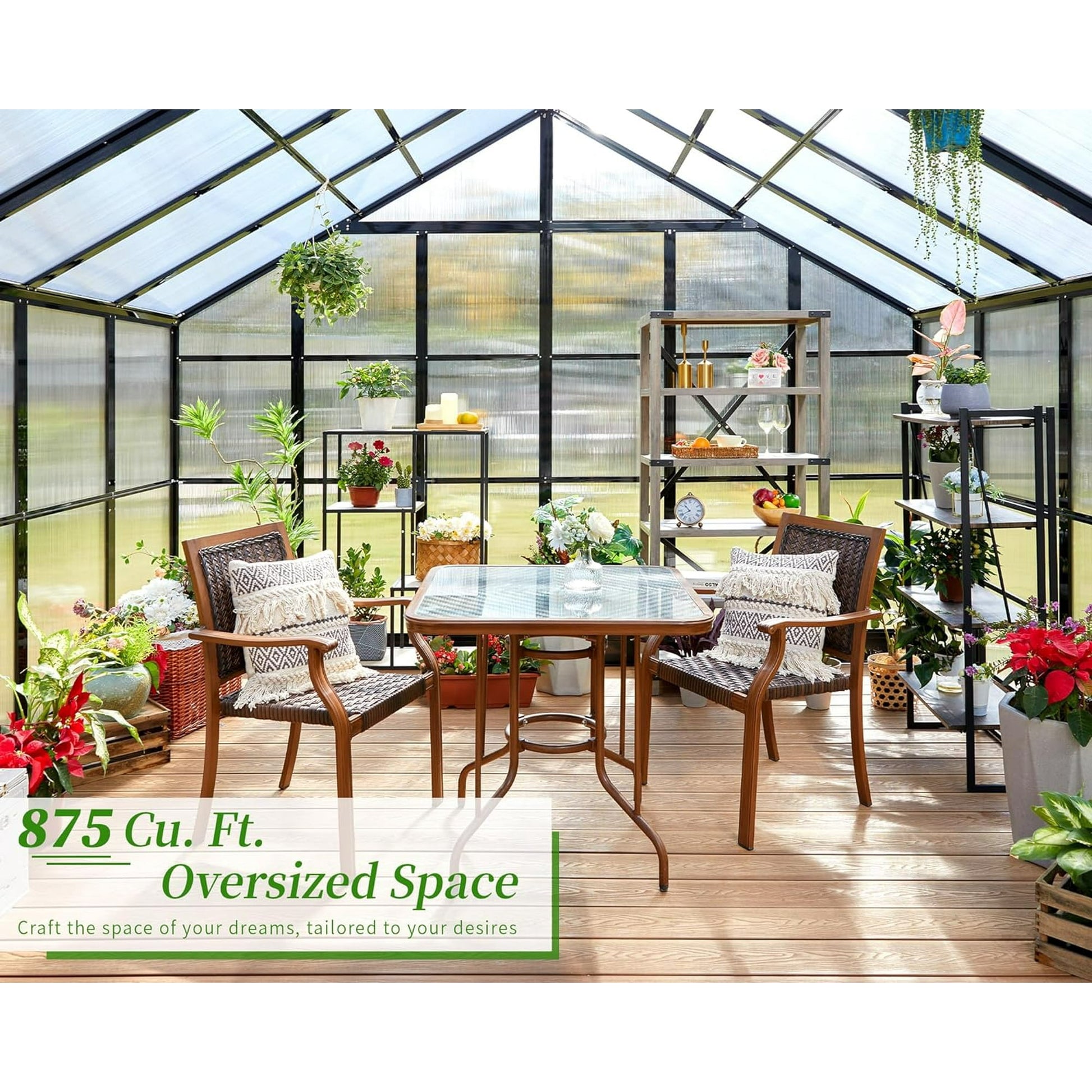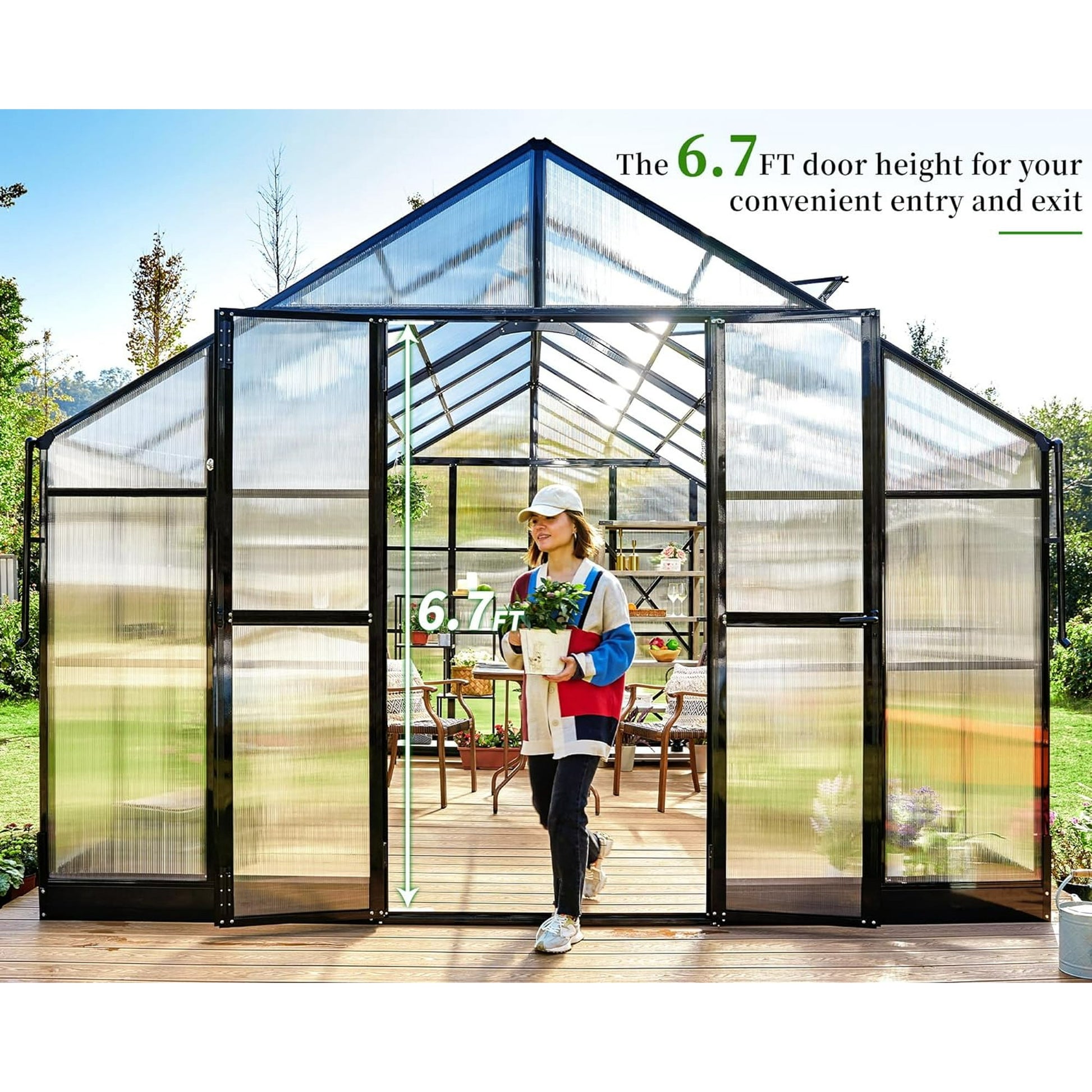 Jocisland 12x13.5x9 ft Polycarbonate Greenhouse with Quick-Connect Fittings for Outdoors, 875 ft² Net Space, Aluminum Frame, Double Doors, Black