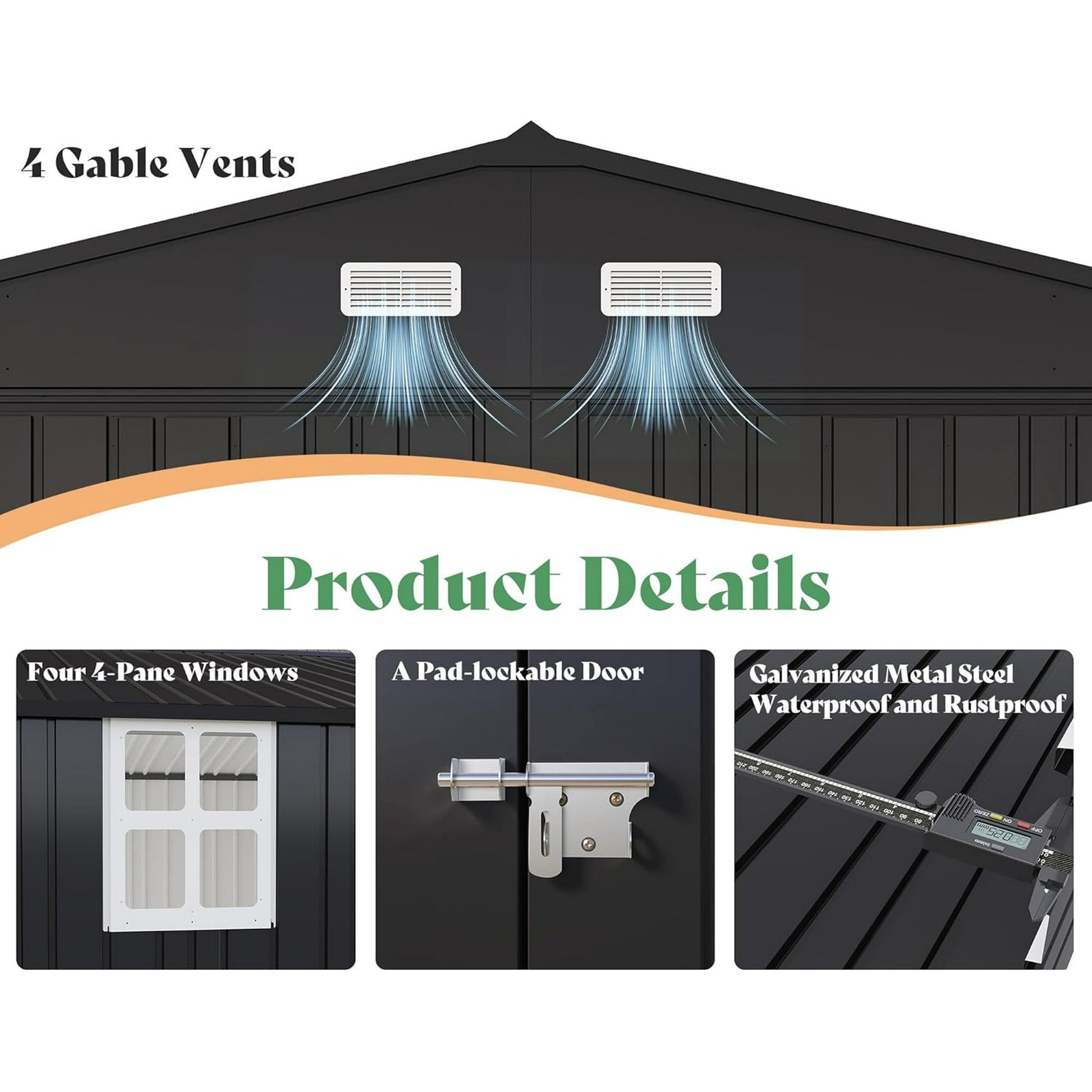 - Durable Construction: The Galvanized Steel metal shed is 0.25mm thick, with an upgraded, stabilized structure that can withstand winds and rainfall. Following the detailed step-by-step installation, it may take four people 16 hours over two days to complete this large shed.