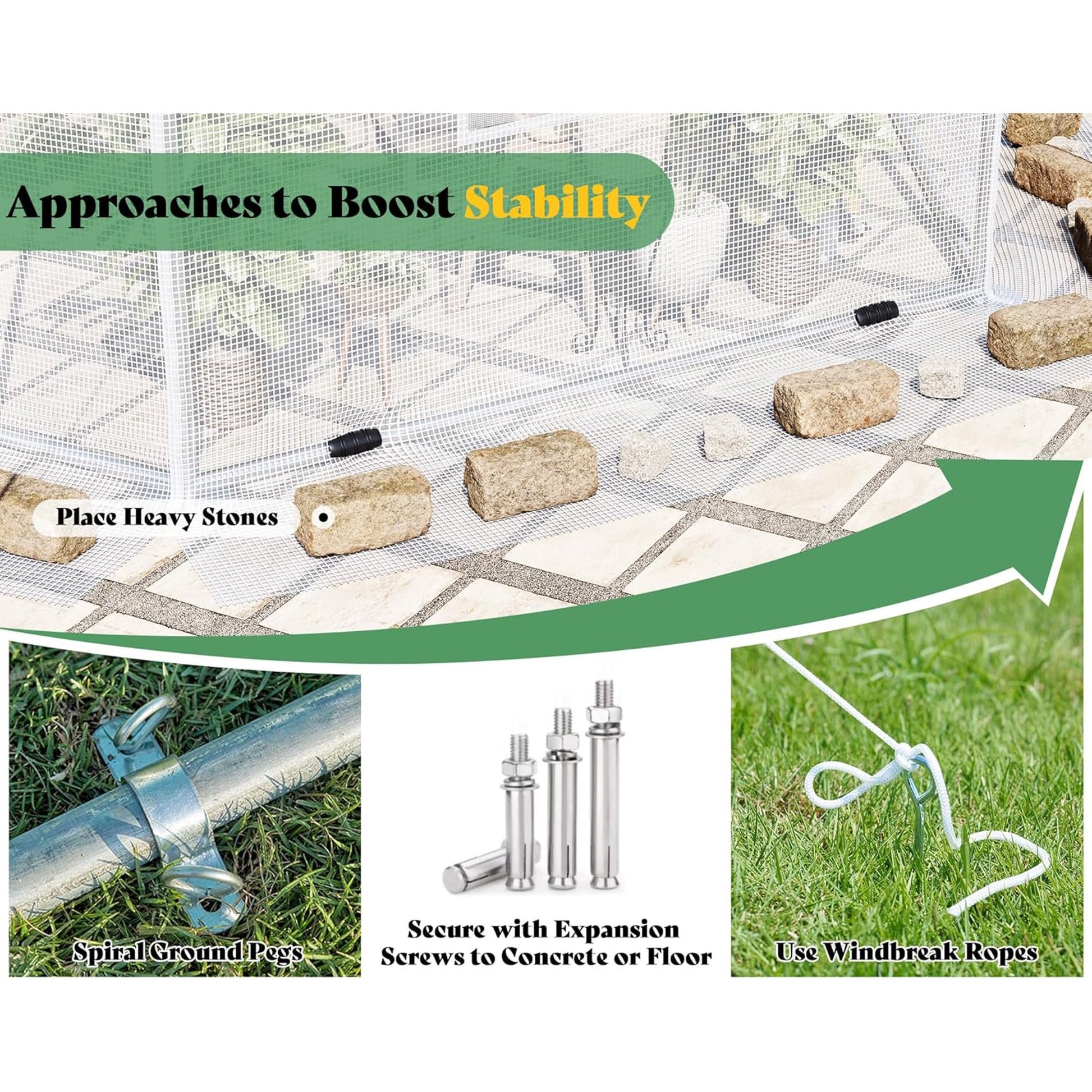 - Approaches to Boost Stability: Greenhouses Include film clips, spiral ground stakes, horse saddle clamp and ropes to provide stability. And the frame allows for optional anchoring to the ground or weight reinforcement