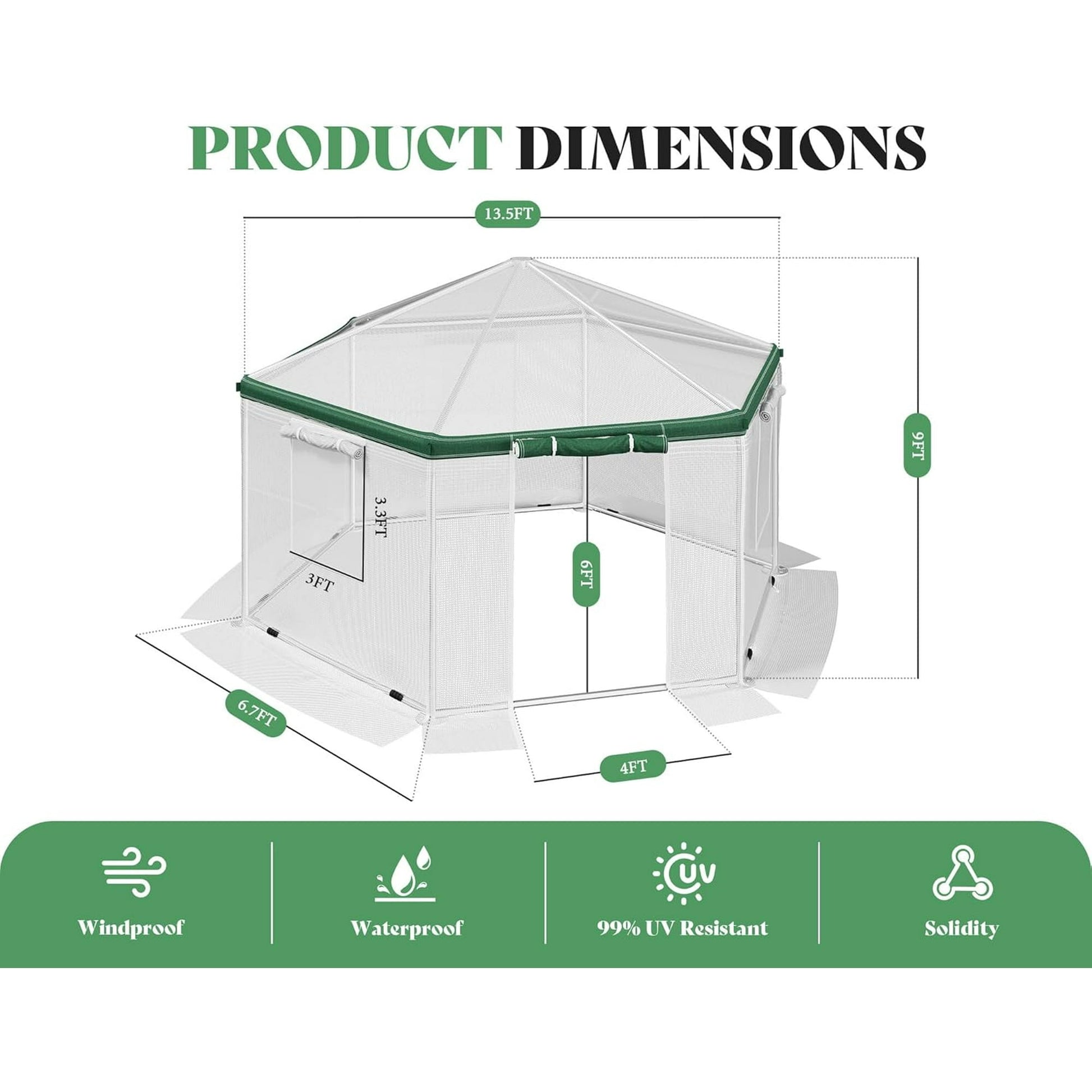 - Generous Planting Area: Enjoy the ample 13.5' x 13.5' dimensions and 9' height our greenhouse offers, the unique hexagonal shape maximizes space, making it ideal for shelving and hanging plants