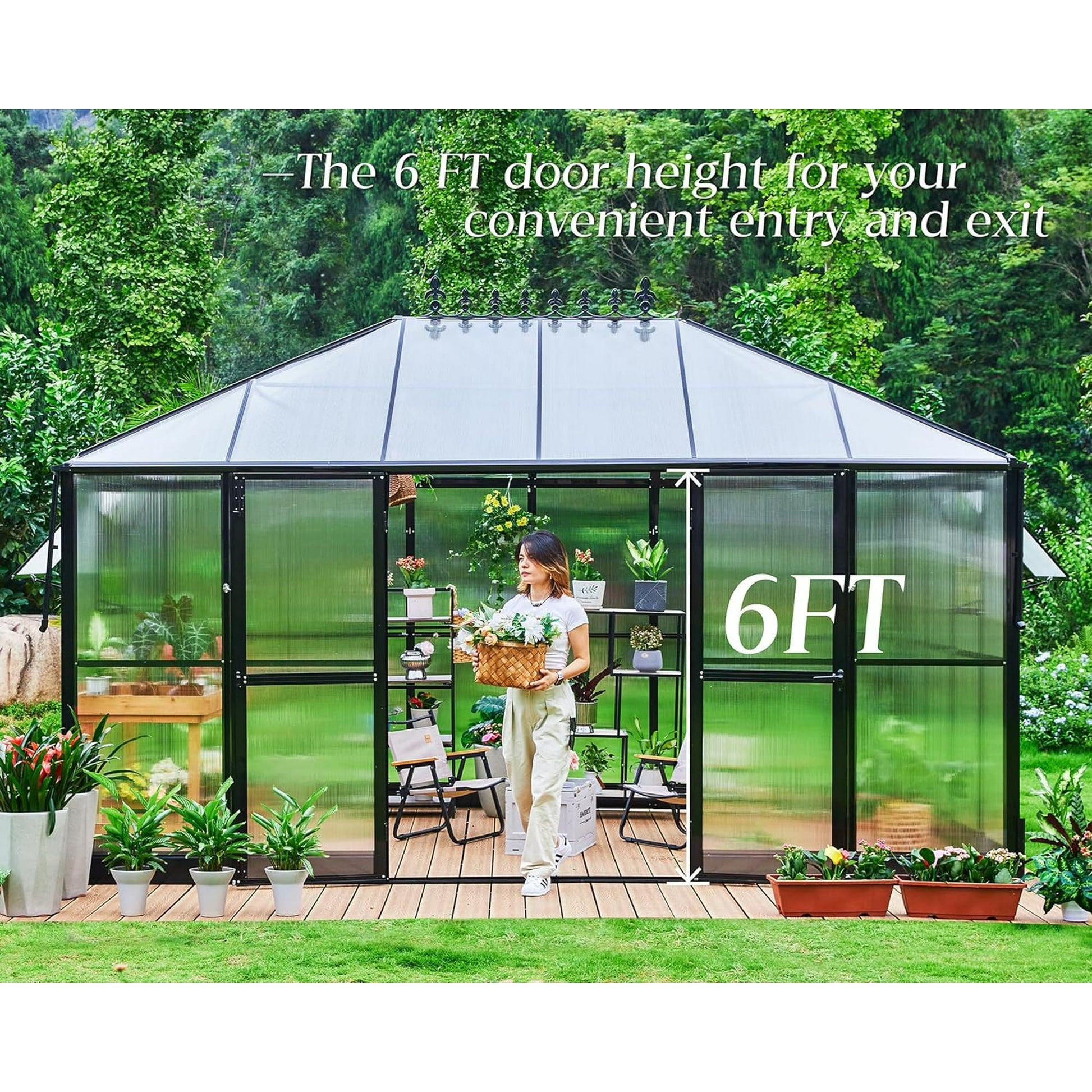 - 【Inserted PC Panel】 6mm twin-wall translucent polycarbonate PC panels, which exceptional 99.99% UV protection and warmth for a cozy environment to facilitate optimal plant growth.The 6-foot-tall widened hinged door offers effortless access for everyone.