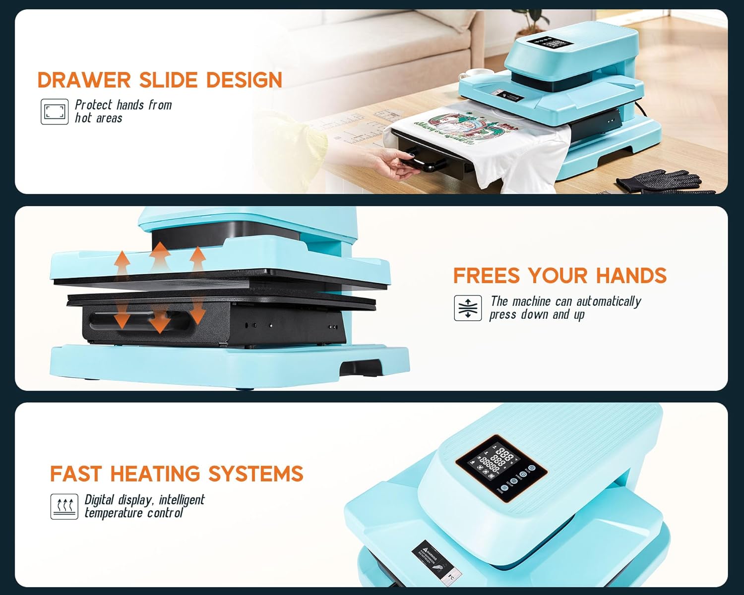 - [SAFE & STABLE] The drawer slides design ensures that you don't get burned, shirt heat press auto releases once the timer goes down for safety and to prevent overheating