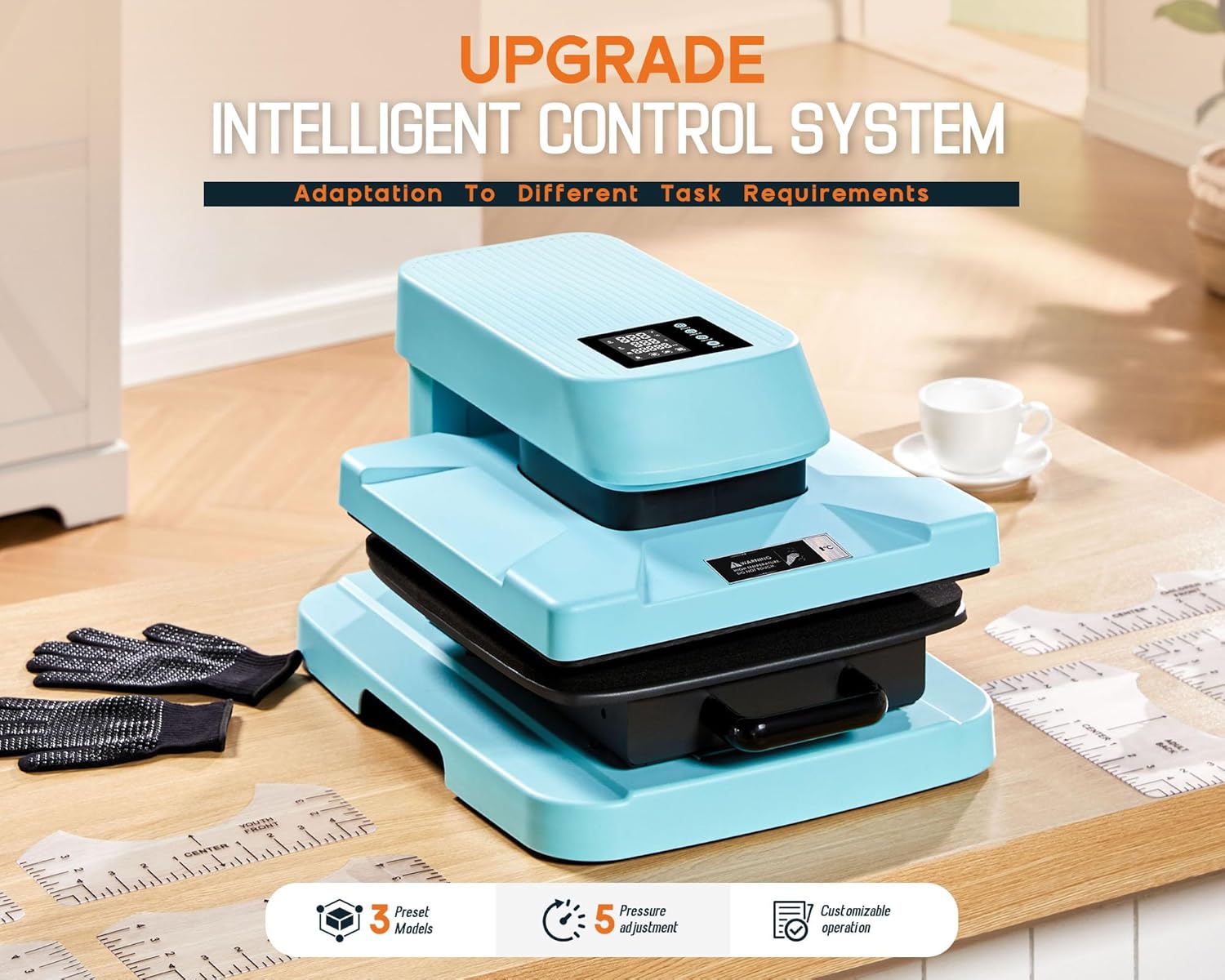 Jocisland 15x15 Inch Heat Press Machine with Auto Release, Smart T-Shirt Printing for HTV, Sublimation & Heat Transfer, Includes 8pc T-Shirt Rulers, Light Blue