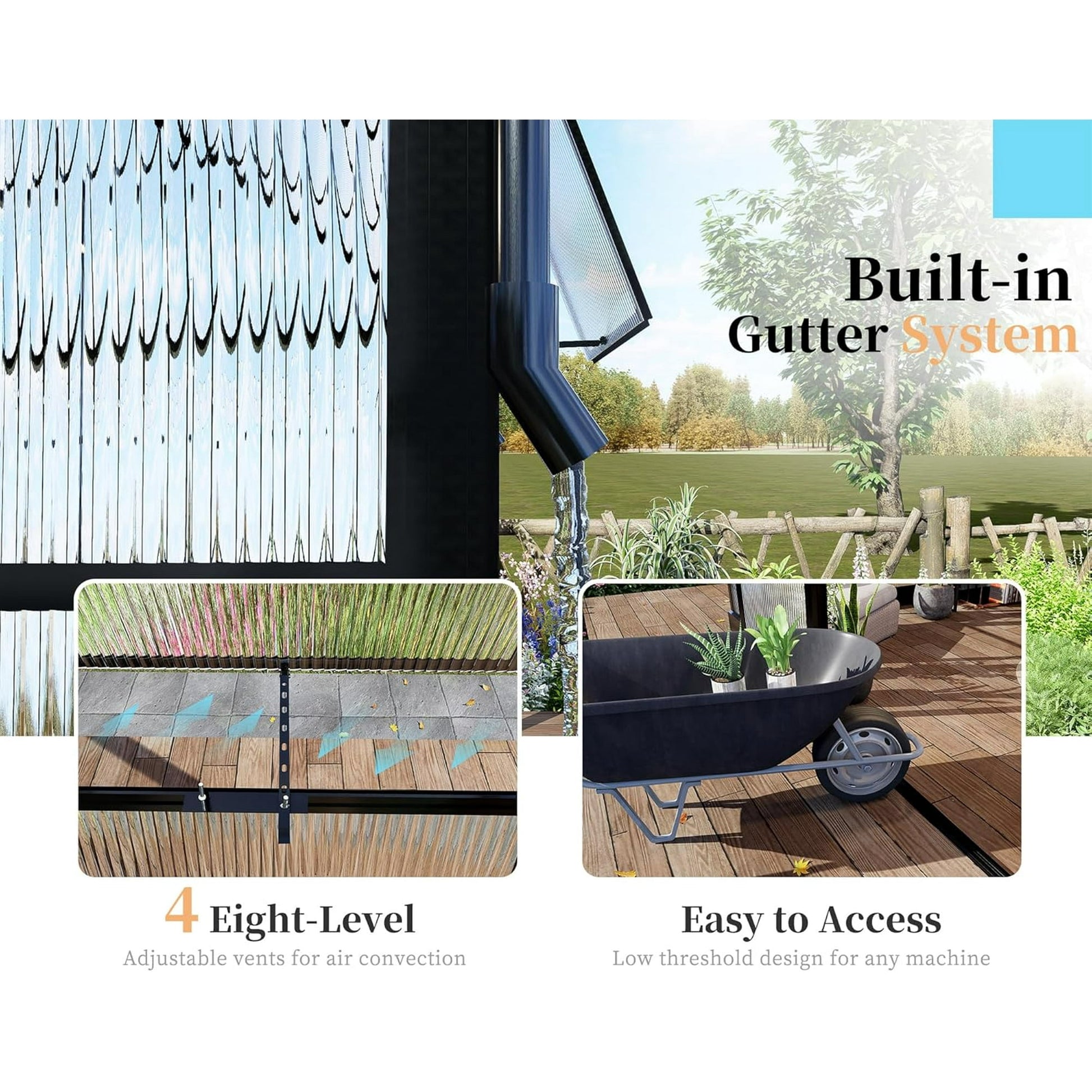 - Convenient Access: Designed with raised door and lower threshold, our greenhouses provide easy access for people and all sorts of gardening equipment,