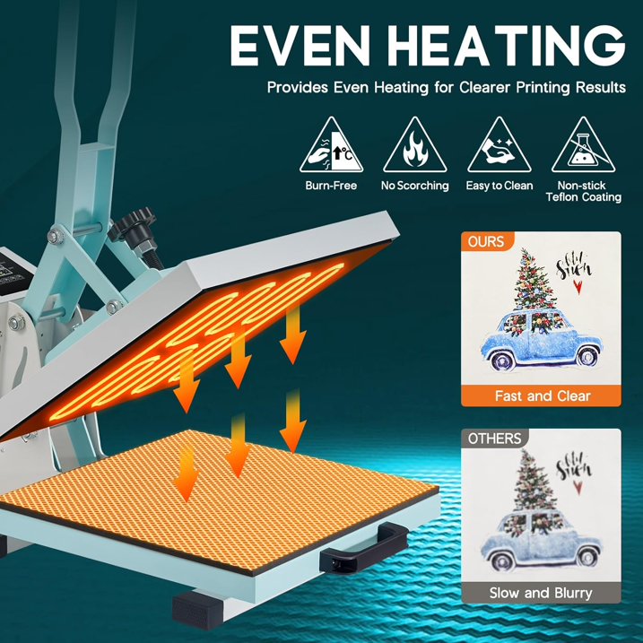 - Even Heating: Delivers uniform and consistent heating across the entire surface, guaranteeing thorough imprinting of patterns with the t-shirt press