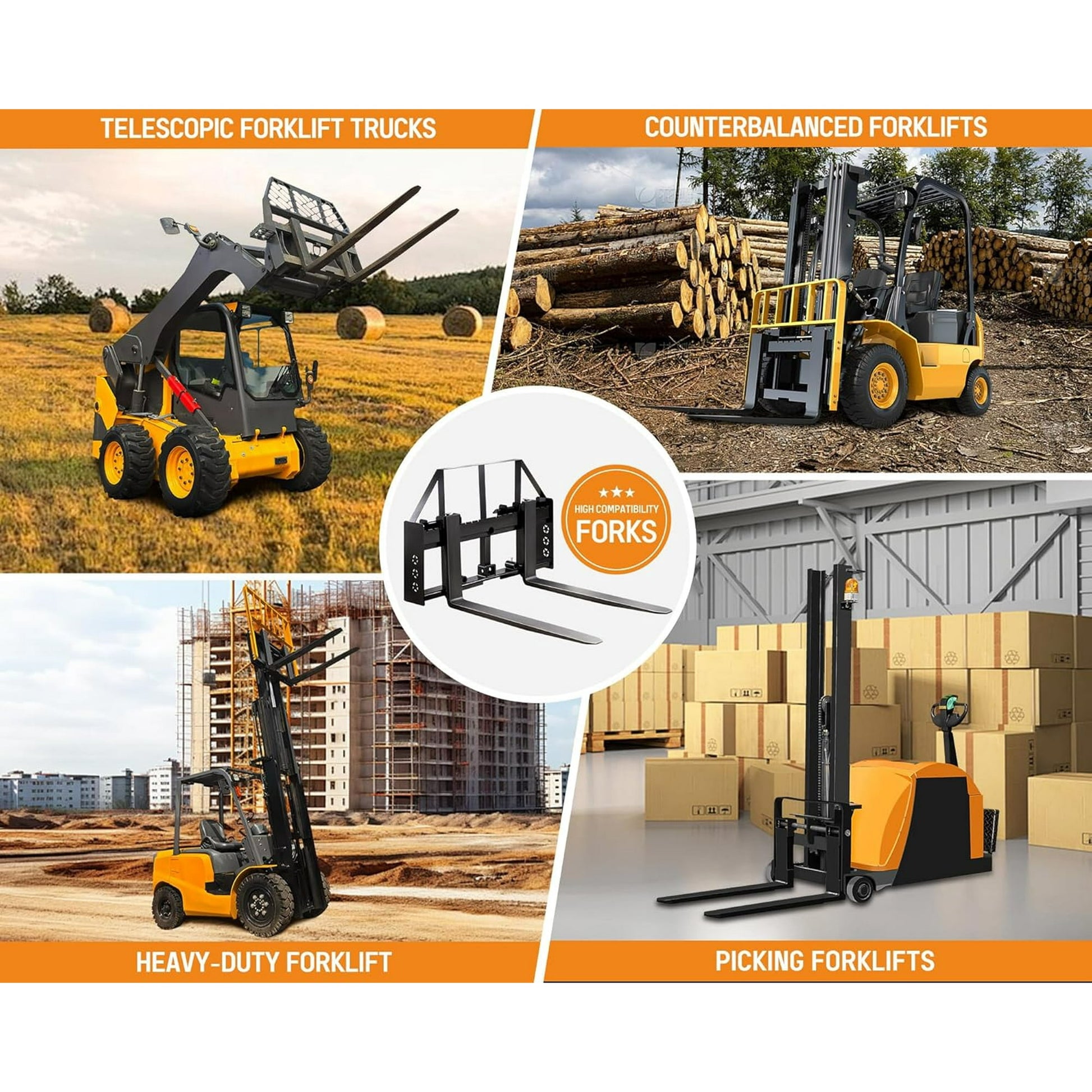 - MULTI-SCENARIO USE: The skid steer pallet forks are widely utilized across farms, factories, and warehouses for efficient loading, unloading, and short-distance transportation