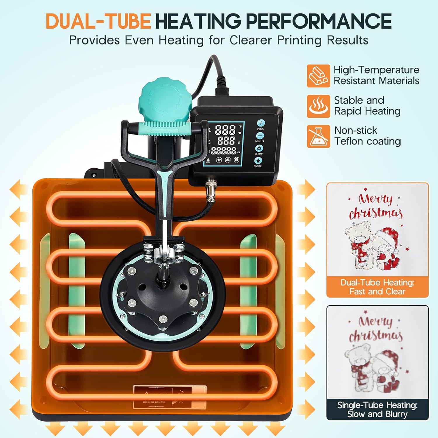 - Dual Tube Heating: Ensures even and consistent heating across the entire surface, guaranteeing complete imprinting of patterns with t shirt press