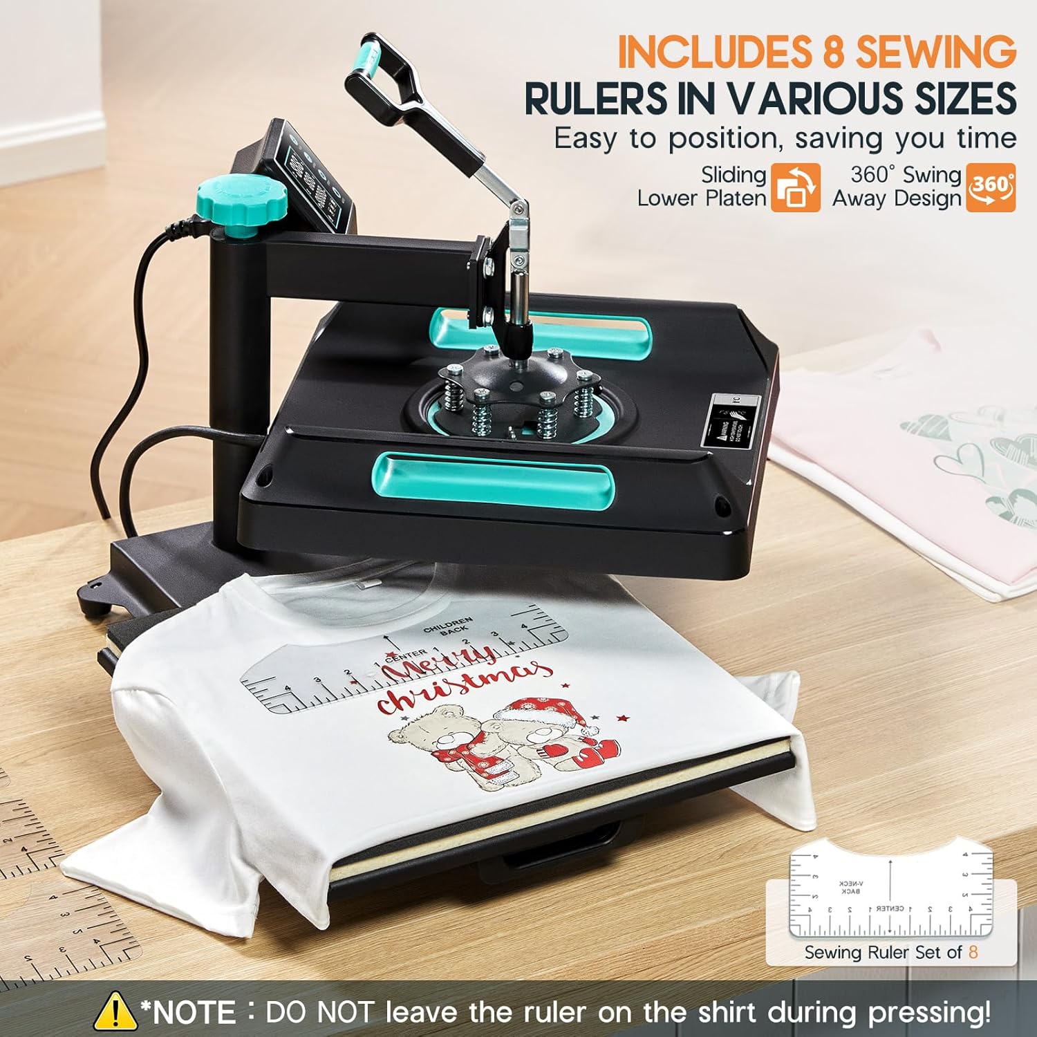 - Safe Placement & Precise Positioning: 15x15 heat press features a 360° swing-away and slide-out design, equipped with 8 sewing rulers for safe and precise item placement