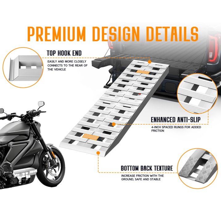 - Enhanced Anti-Slip Design: 4" spaced rungs give the tires more contact area. The textured surface of the loading ramp and the half-blade foot further enhance traction, minimizing the risk of tipping or slipping when using the ramp
