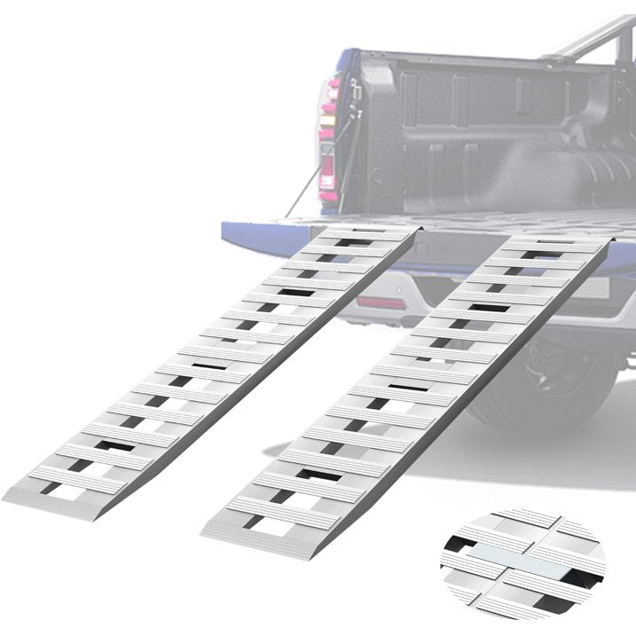 - Widely Used: Perfect for loading two-wheeled vehicles (motorcycles, bicycles) and four-wheeled vehicles (ATVs, UTVs, lawn mowers, and pickup trucks). Aluminum car ramps are ideal for use on farms, docks, or outdoor repair and transport scenarios