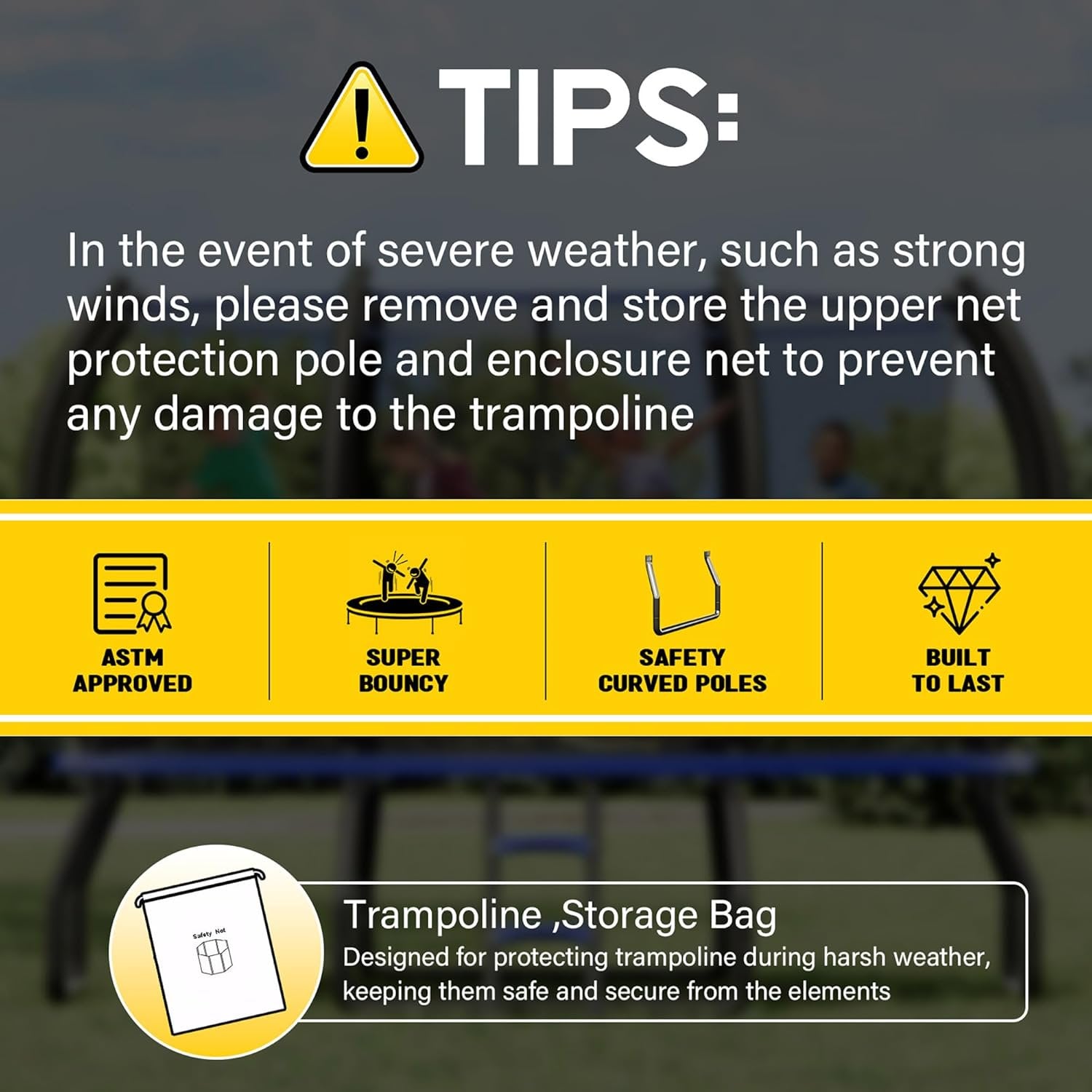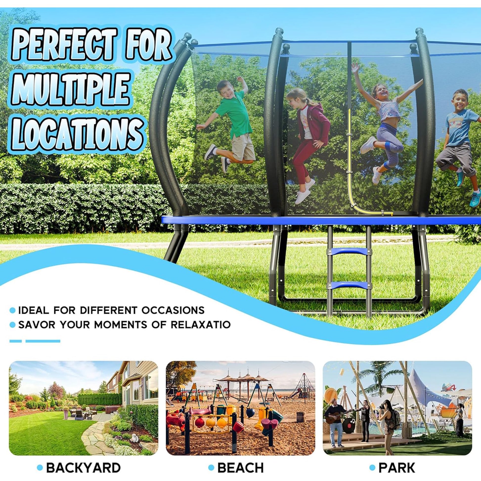 - Safe Jump: Our outdoor trampoline meets ASTM F381-16 safety standards. Six outward-curved trampoline poles wrapped in pearl cotton effectively prevent collisions with hard surfaces, ensuring a safe environment for children to enjoy trampoline fun.