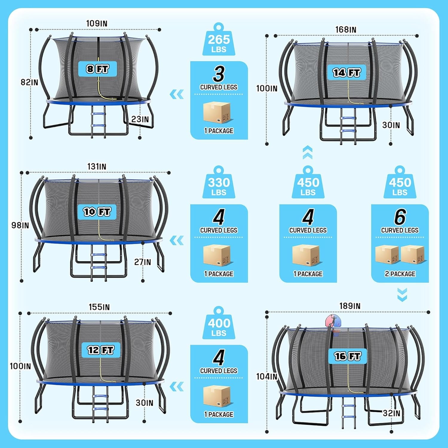 - Power Every Jump: Our trampoline springs are made of carbon steel and securely attached to the frame. The high-density PP mat offers strong elasticity and comfort. Unique trampoline leg structure conforms to mechanics and has stable load-bearing capacity.
