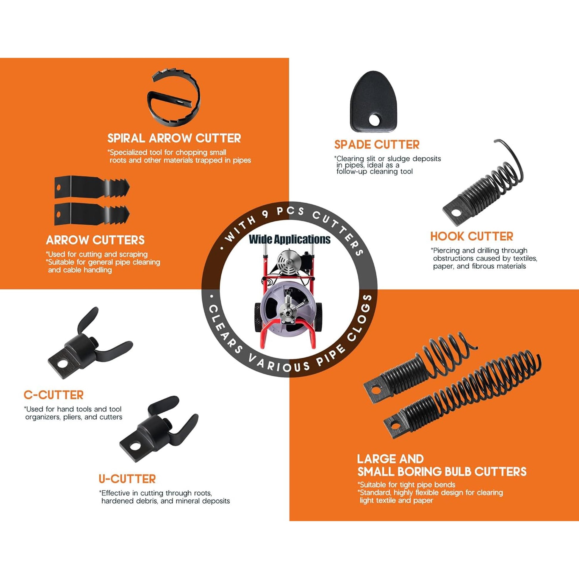 - Extensive Applicability: The drain cleaner tool equipped with 9 Replaceable Cutters, included arrow cutters, spiral arrow cutter, spade cutter, large and small boring bulb cutters, C-cutter, U-cutter, it effectively clears clogs in pipes, floor drains, sinks, toilets, and more, making it ideal for homes, businesses, restaurants, and factories
