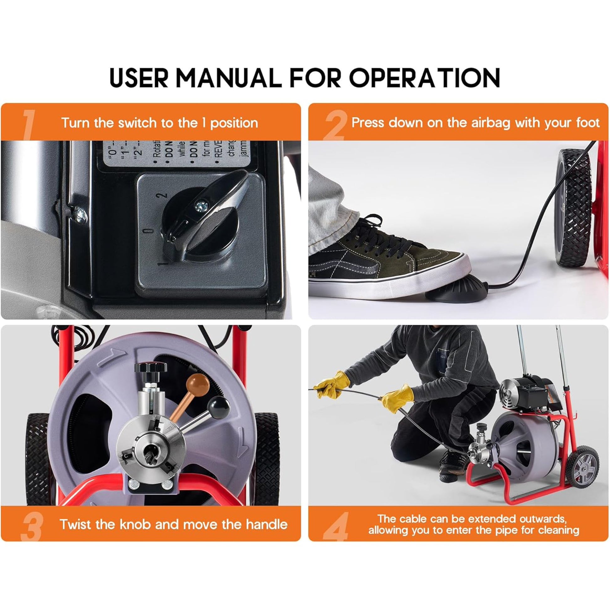 - Efficient Auto-feed Function: Our plumbing snake allows smooth and continuous cable advancement, the CW/CCW knob and air-activated foot switch reduce manual effort and make the cleaning process faster and more efficient