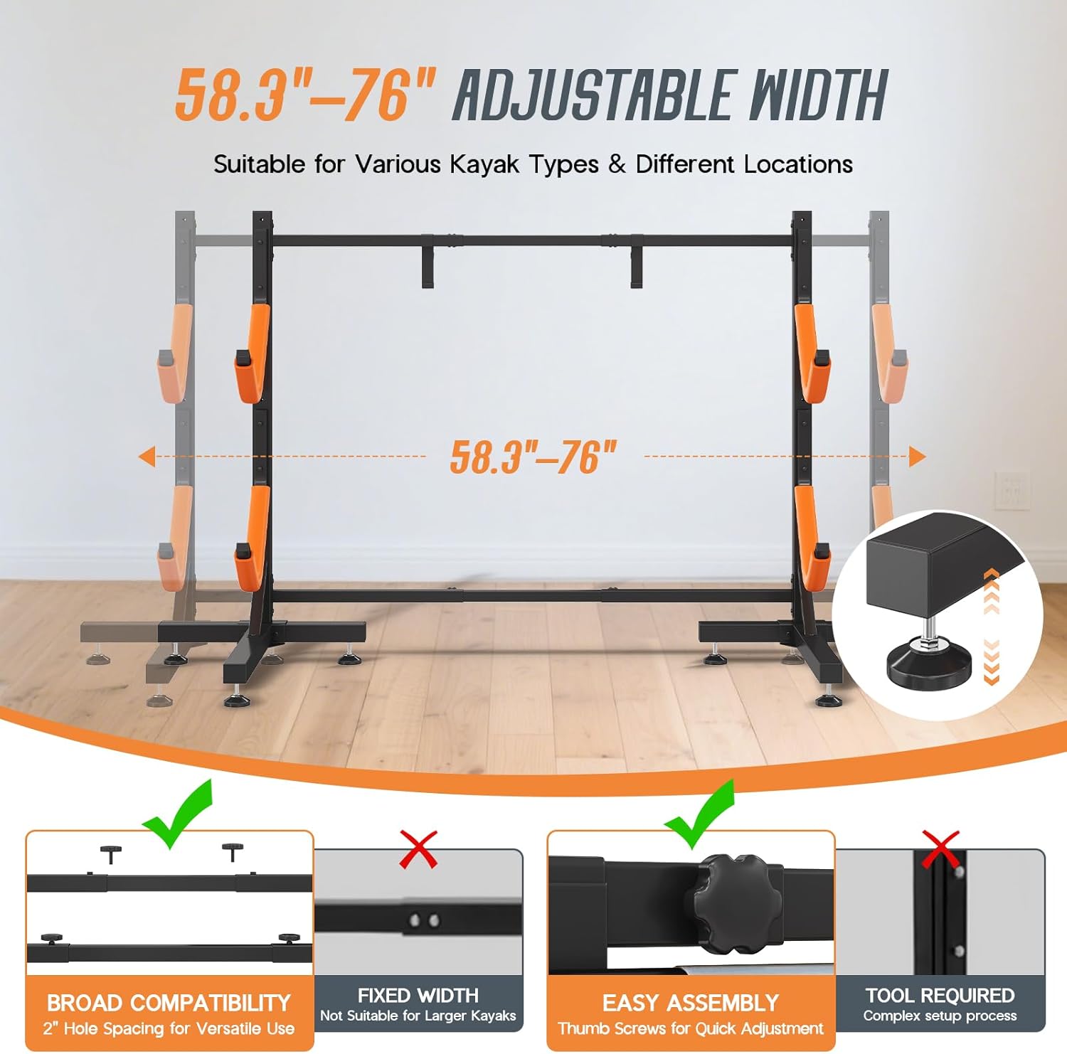 - Wide Compatibility: Tool-free adjustable kayak storage width from 58.3-76in and height by 1.57 in (4 cm). Freely place anywhere without drilling, adaptable to various kayak sizes and scenes
