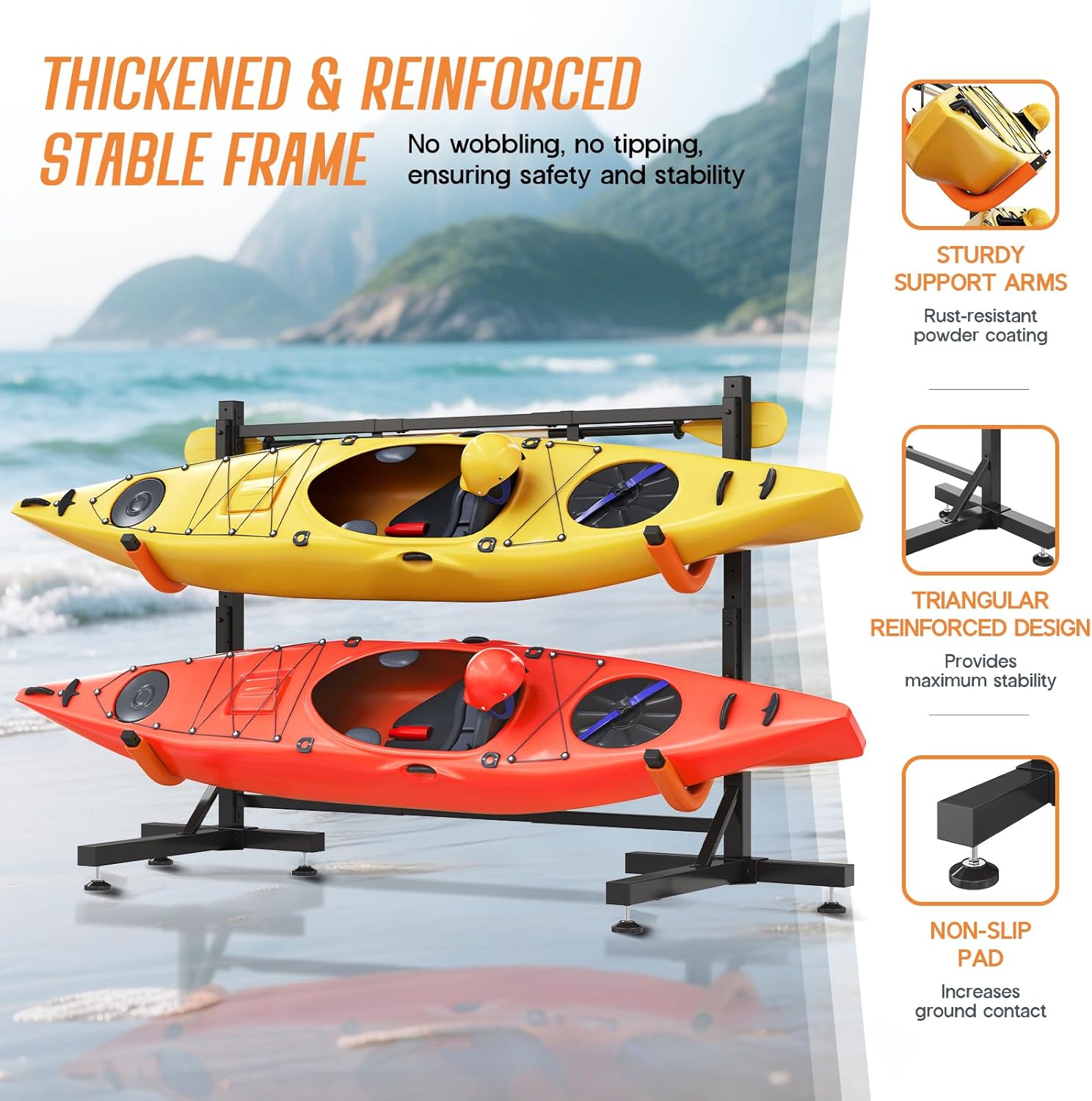 - Large Capacity: Made of heavy steel structure, freestanding kayak rack supports up to 175 lbs/79.45 kg. Holds 2 kayaks or other water sports gear without bending or breaking over time.