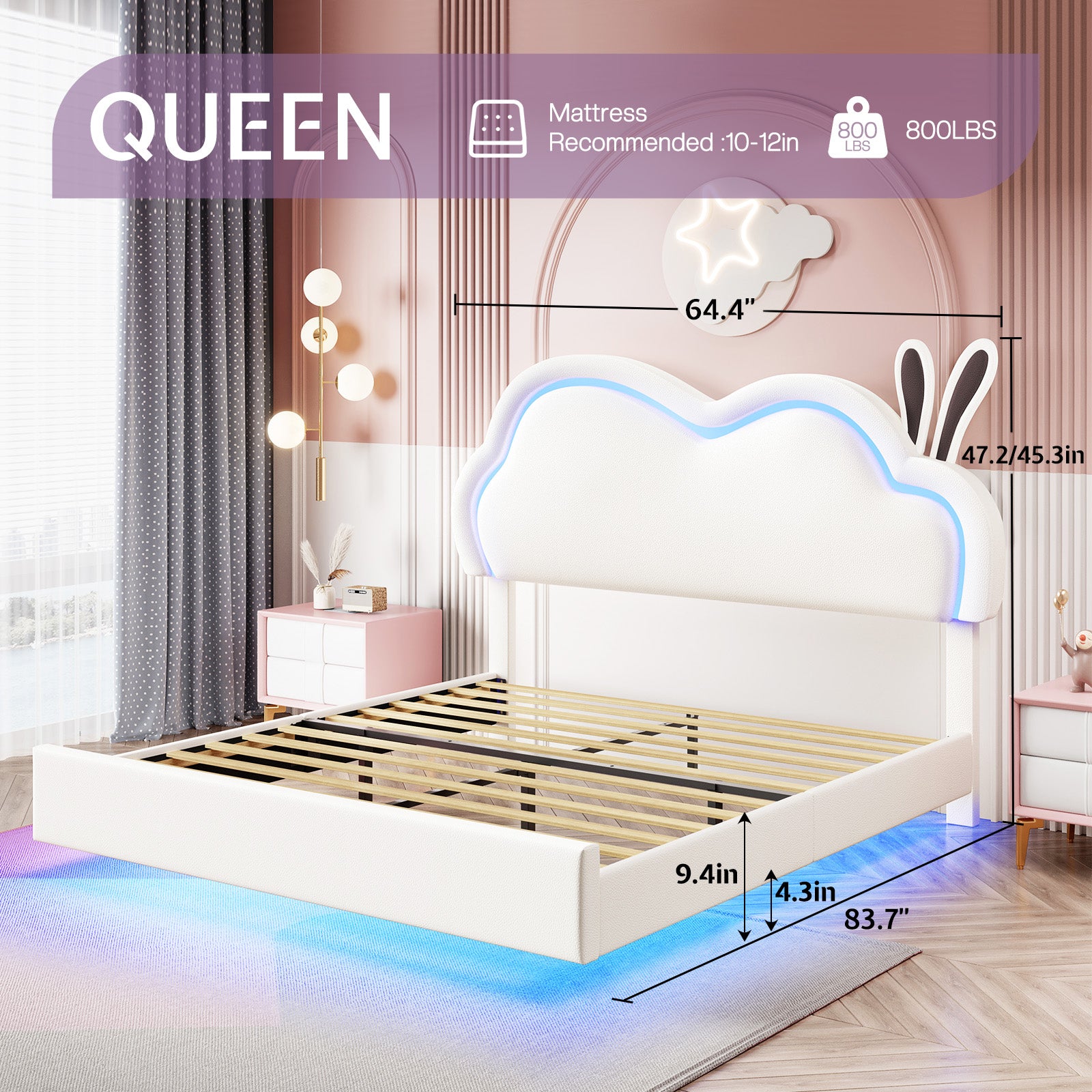 Jocisland LED Queen Bed Frame for Girls Upholstered Floating Bed with Cute Cloud Headboard, No Box Spring Needed, Leather, White