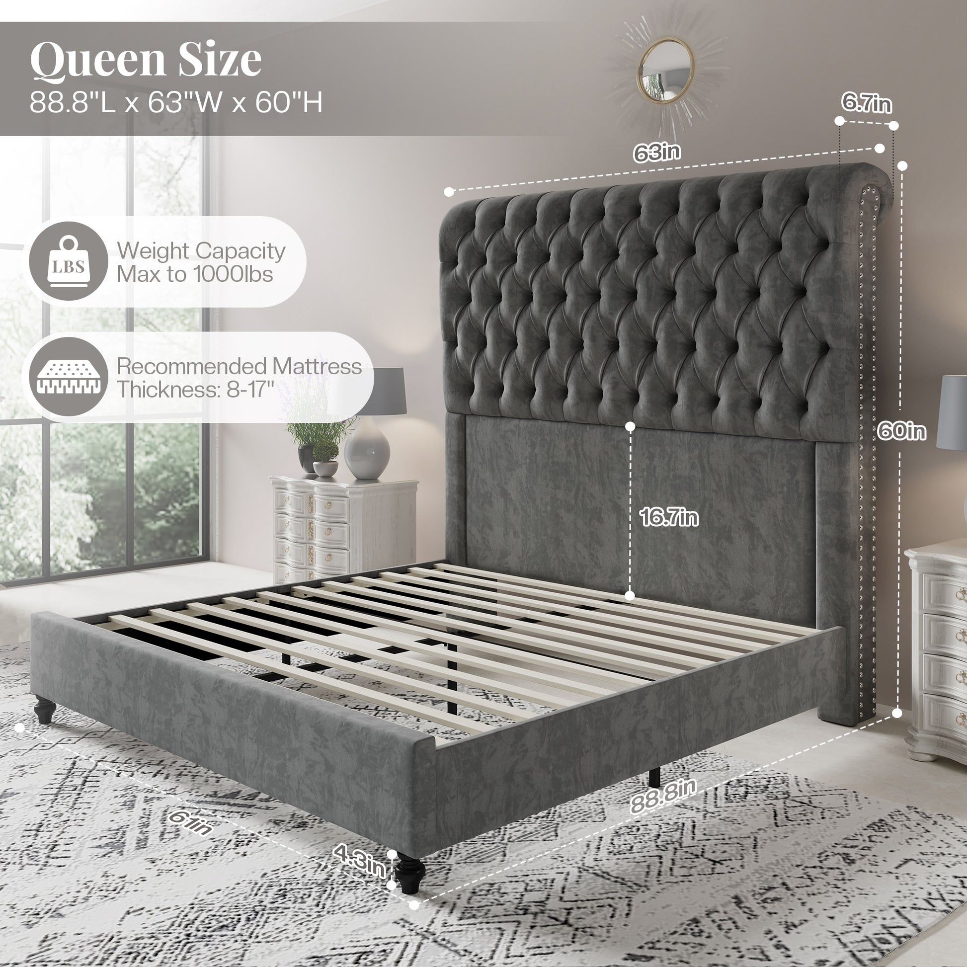 Jocisland Queen Size Platform Bed Frame with 60" Tall Sleigh Headboard, Luxury Velvet Upholstered Bed, Handcrafted Deep Button Tufted, Solid Wood Legs, Noise-Reducing, No Box Spring Needed,Light Gray