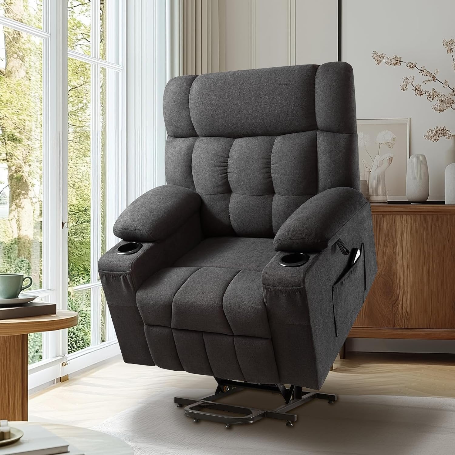 In today's fast-paced world, we all need a moment to unwind. Our top-of-the-line power lift recliner is ideal for that, especially for the elderly! Picture a spacious seat that lets you stretch out and feel at ease. The recliner measures 35.8" deep, 37" wide, and 40.9" high. This design effortlessly combines size and comfort! The chair's oversized armrests look fantastic and provide extra support. They feature special padding that contours perfectly to your arms for added comfort. Switching between lift and recline modes is super easy with just one remote control, making it a breeze to adjust. This big and tall recliner is filled with high-density foam to help reduce fatigue.And the chair also has a sturdy metal support base that ensures stability and safety. Whether you're relaxing or getting ready for a great movie, our recliner chairs provide the perfect support for those leisurely moments!