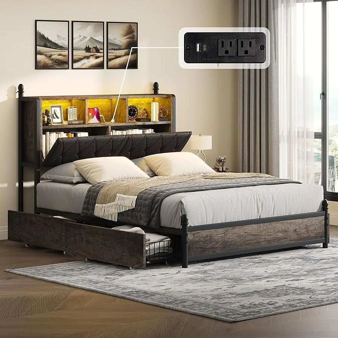 VANACC Bed Frame with Bookcase Headboard and 4 Storage Drawers, Wooden Platform Bed with Charging Station and LED Light, No Box Spring Needed/Noise-Free