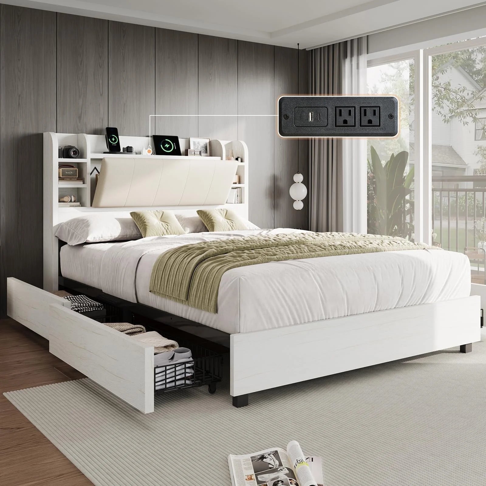 PLAUIN Bed Frame with Storage Drawers, 47.2" Headboard and Wooden Platform