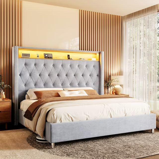53.2" tall wingback headboard with velvet button tufted providing luxurious comfort and much more comfortable support.This bed features LED lights with over 6000 color options. Use the included remote to effortlessly customize the ambiance.Bookcase headboard allows you to place items & Built-in Charging Station with UBS & Type-C ports for convenient device charging.Stable bed frame with noise-free EVA strips and fixed wood slats. Embeded design rails keep the mattress from sliding.All components are clearly labeled and numbered, ma the platform bed easy to match and assemble. Two people recommended.