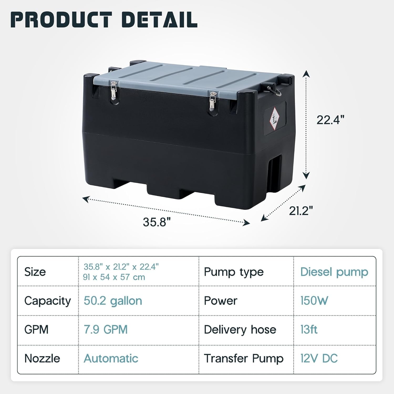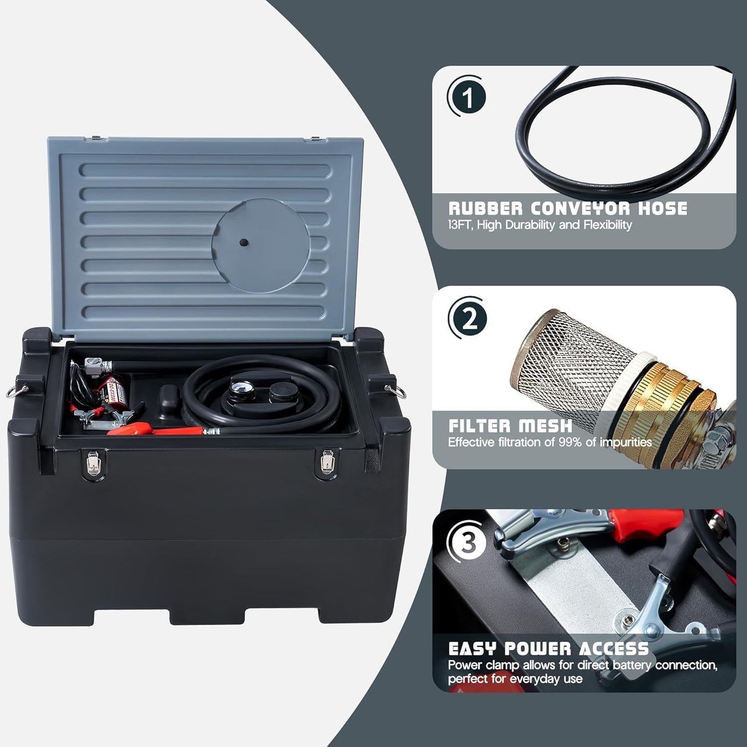 - Efficient&Convenient: 58-gallon diesel tank delivers a flow rate of 10.6 GPM and includes a clear diesel gauge to monitor fuel levels, enhancing work efficiency. Power: 150W; Voltage: 12V