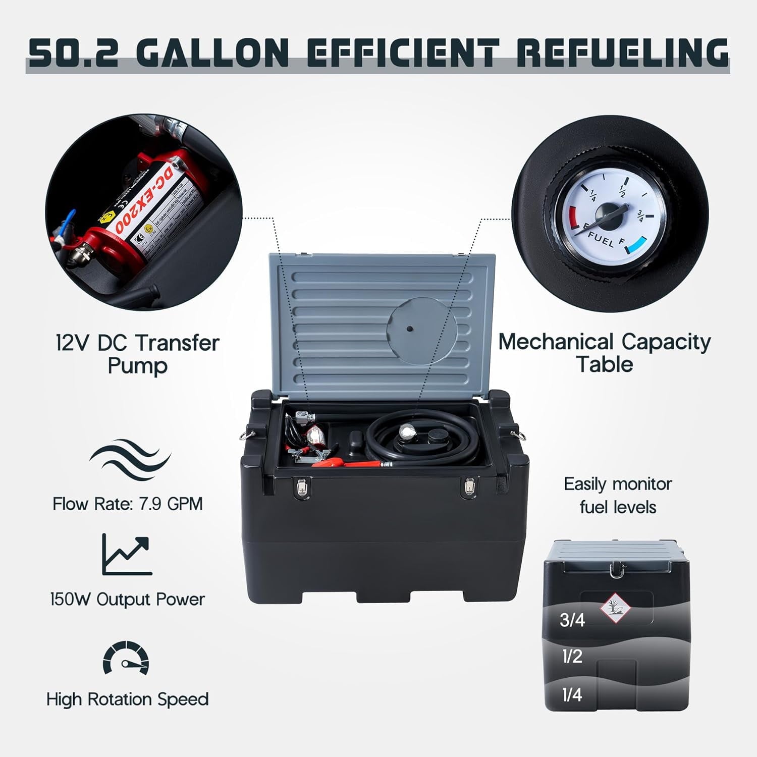 Portable Fuel Tank, 50 Gallon Capacity & 8 GPM Flow Rate, PE fuel transfer tank with 12V Electric Transfer Pump and 13.1ft Rubber Hose, Black