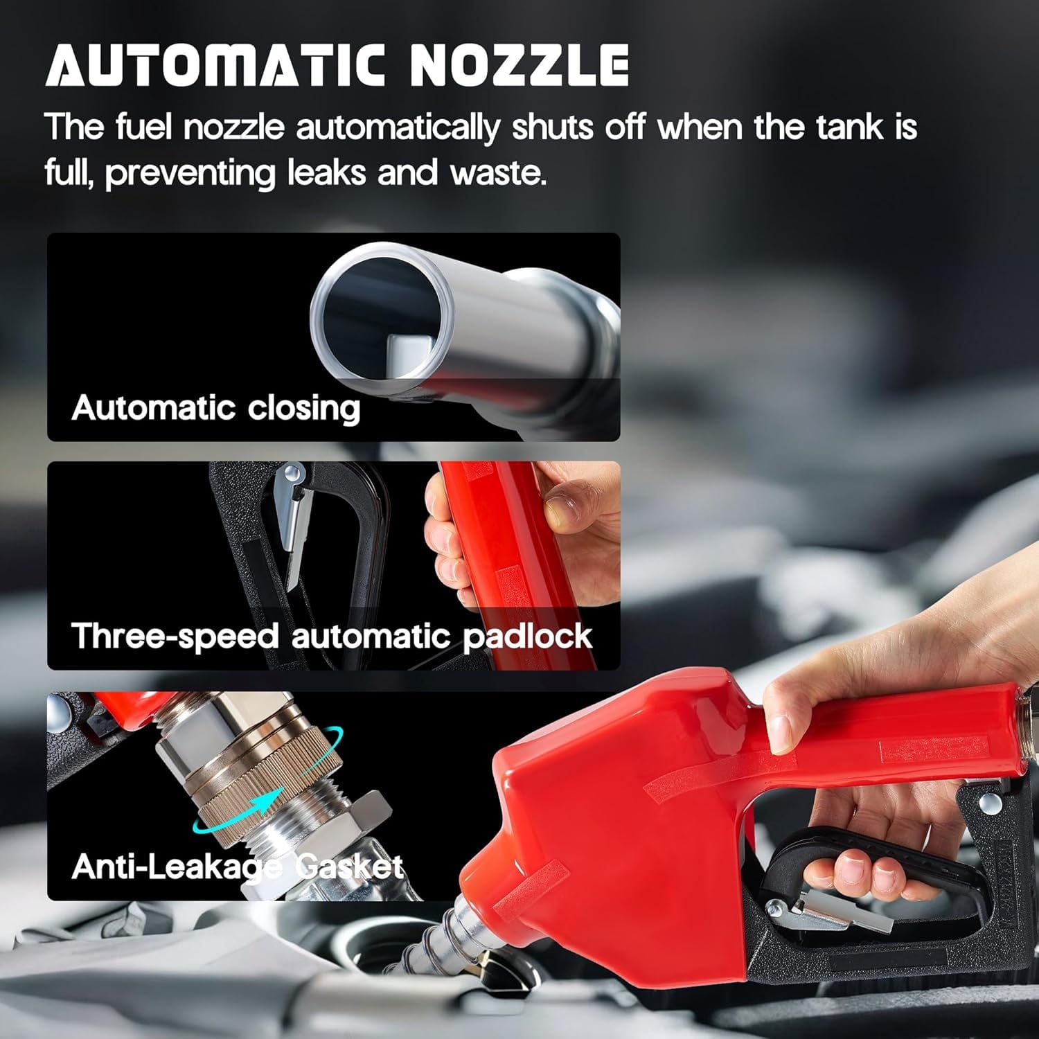 - Efficient Auto Nozzle: Durable aluminum alloy nozzle on diesel transfer tank shuts off automatically when full, preventing waste and leaks. The 360° swivel connector avoids hose tangling for easy use